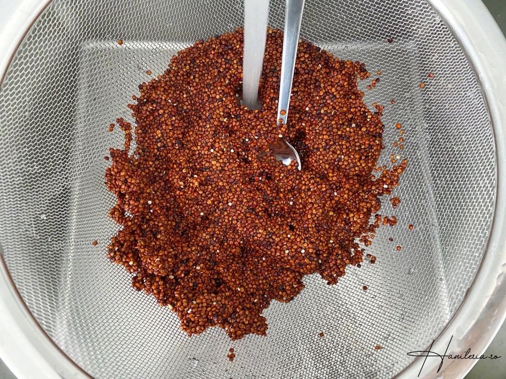 Pentru a scăpa de gustul amar, punem quinoa înmuită într-o sită si o spălăm foarte bine sub mai multe jeturi de apă rece.