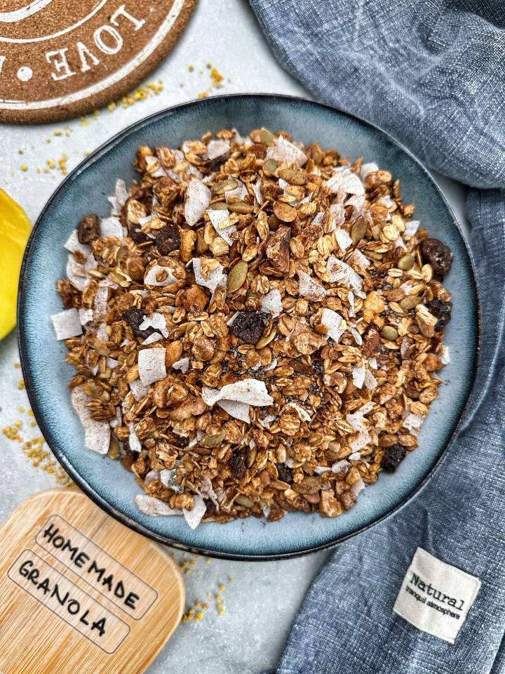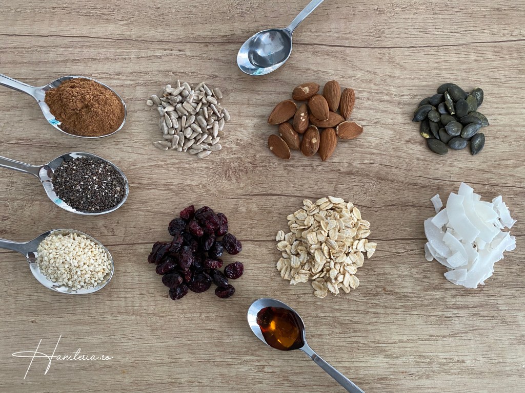 De cele mai multe ori granola cumpărată din comerț este plină de zahăr adăugat și alte nebunii mai puțin sănătoase. De aceea vă propun astăzi o rețetă de granola făcută în casă, în care avem control deplin asupra ingredientelor. O să fiți foarte încântați de rețetă pentru că nu este doar rapidă, ci și foarte gustoasă. Combinațiile sunt diverse, dar azi am folosit ingrediente pe care le aveam deja și pe care le folosesc și în alte preparate, nefiind nevoie să cumpăr alimente special pentru această rețetă. E de preferat ca fulgii de ovăz folosiți să fie varianta mai mare și nu de-ăia foarte fini.