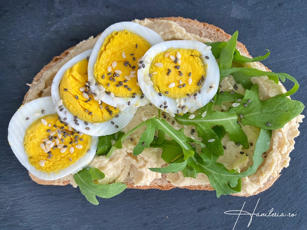 Varianta nr. 2 – Hummus toast cu ou fiert și rucola