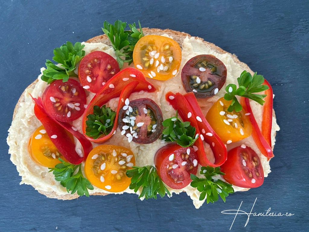 Varianta nr 1 – Hummus toast cu roșii și ardei
