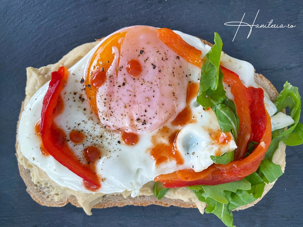 Varianta nr. 4 – Hummus toast picant cu ochi de ou și ardei copt