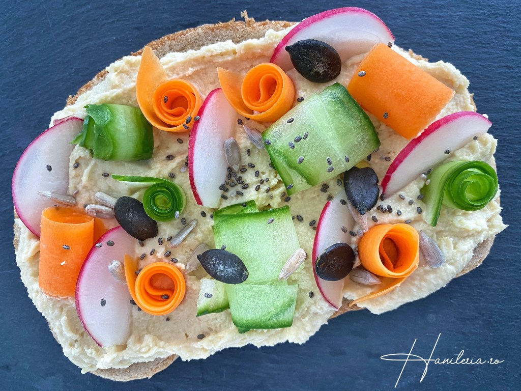 Hummus și crudități , ce pot să spun mai mult? Am ales astăzi câteva fâșii sexy de morcov, castravete și ridiche care adaugă o textură crocantă, în contrast cu hummusul nostru mătăsos și cremos. O ploaie de semințe și tot ce ne mai rămâne este să savurăm acest delicios hummus toast.