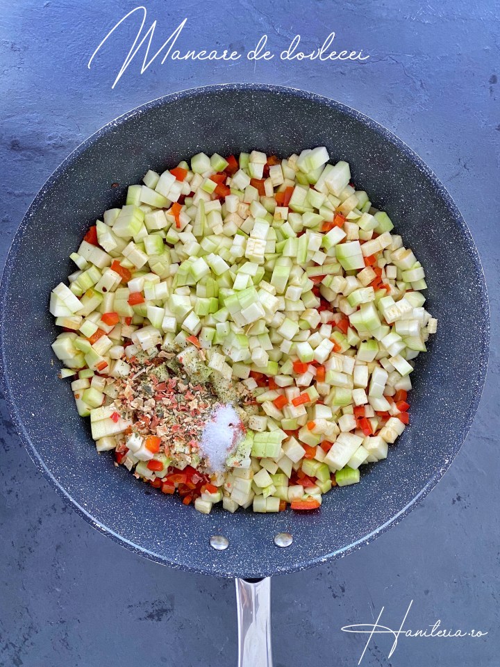 Trântim dovlecelul în tigaie alături de ceapa și ardeiul ușor călite. Adăugăm și legumele deshidratate, sare, piper și o jumătate de pahar de apă. Nu adăugăm foarte multă apă pentru că, dovlecelul fiind destul de apos, lasă destul de multă zeamă.
