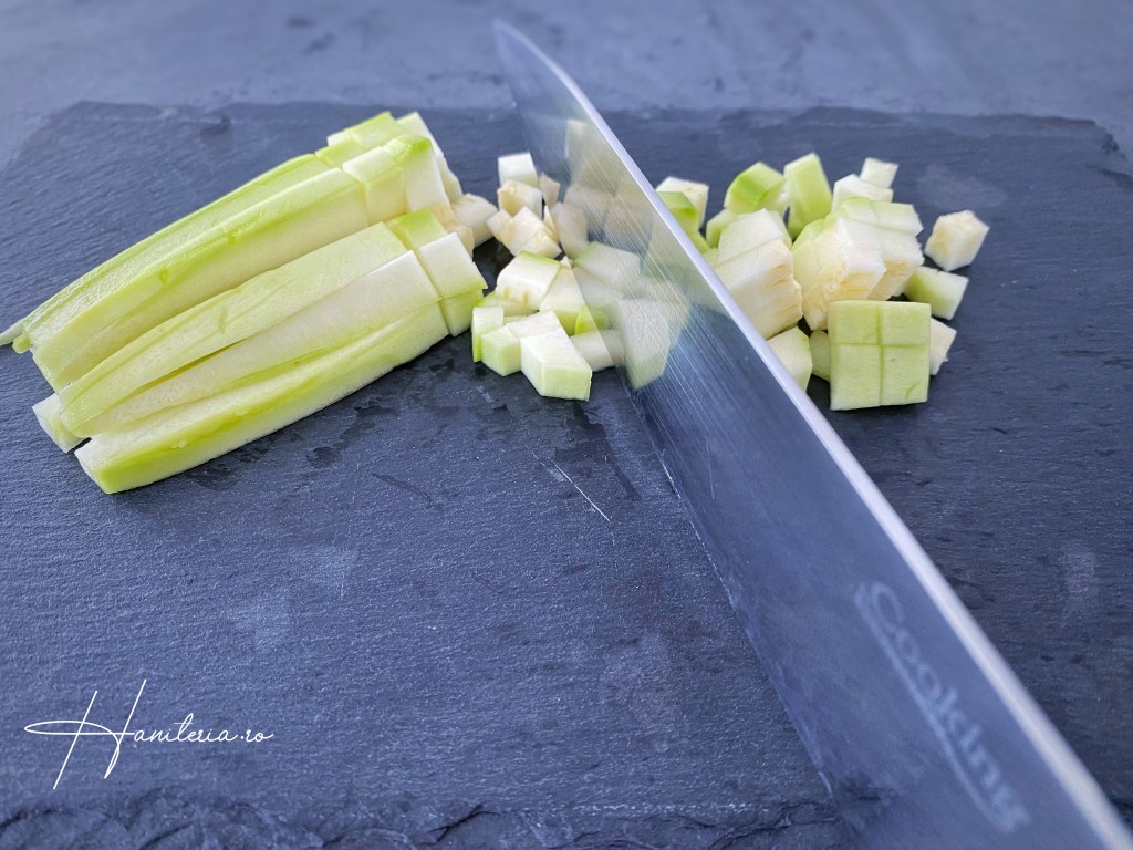 Tăiem dovlecelul cubulețe. Nu vă lăsați intimidați de cantitatea mare de dovlecei, ei scad foarte mult.