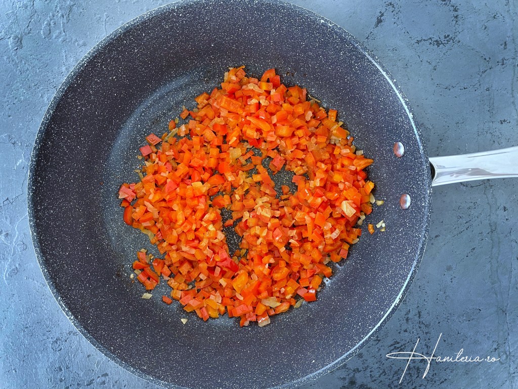După ce ceapa a devenit translucidă, adăugăm și ardeiul și le călim împreună pentru căteva minute. Amestecând din când în când să nu se ardă.
