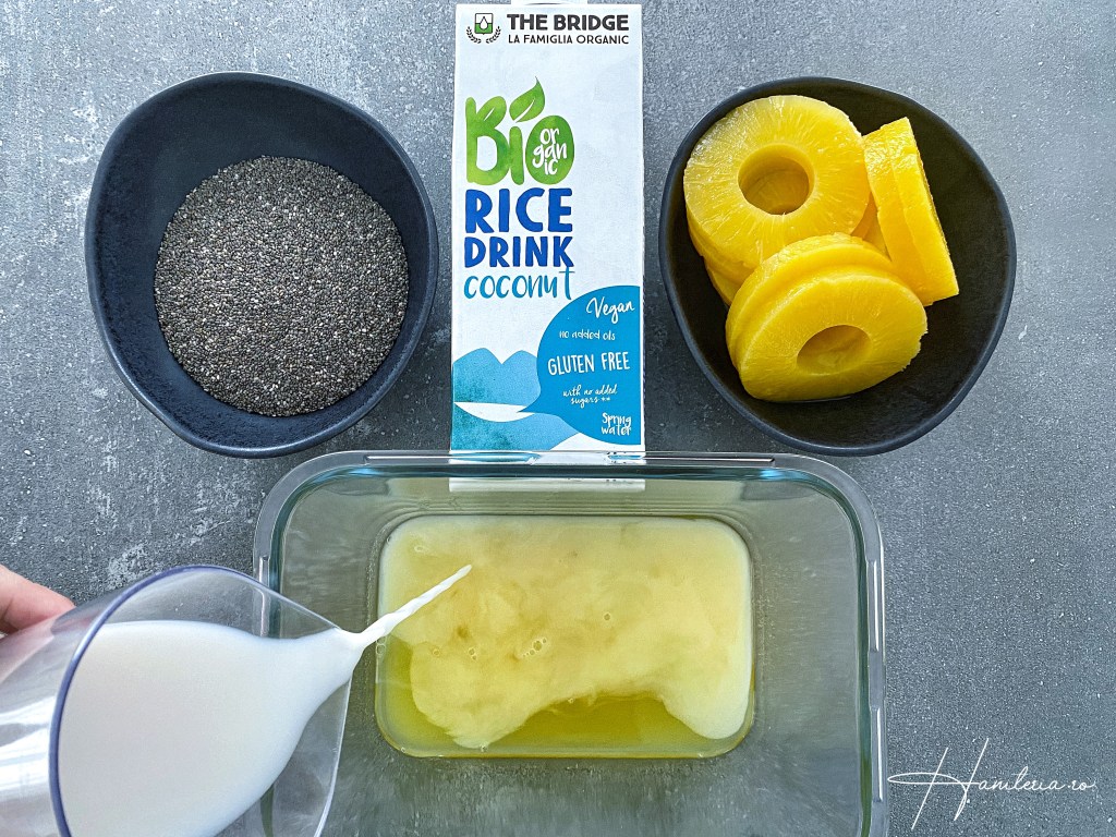 - Lapte de orez cu cocos The Bridge (trebuie sa avem 500 ml lichid in total – cantarim sucul de ananas obținut si completăm cu laptele vegetal) *vezi Notă