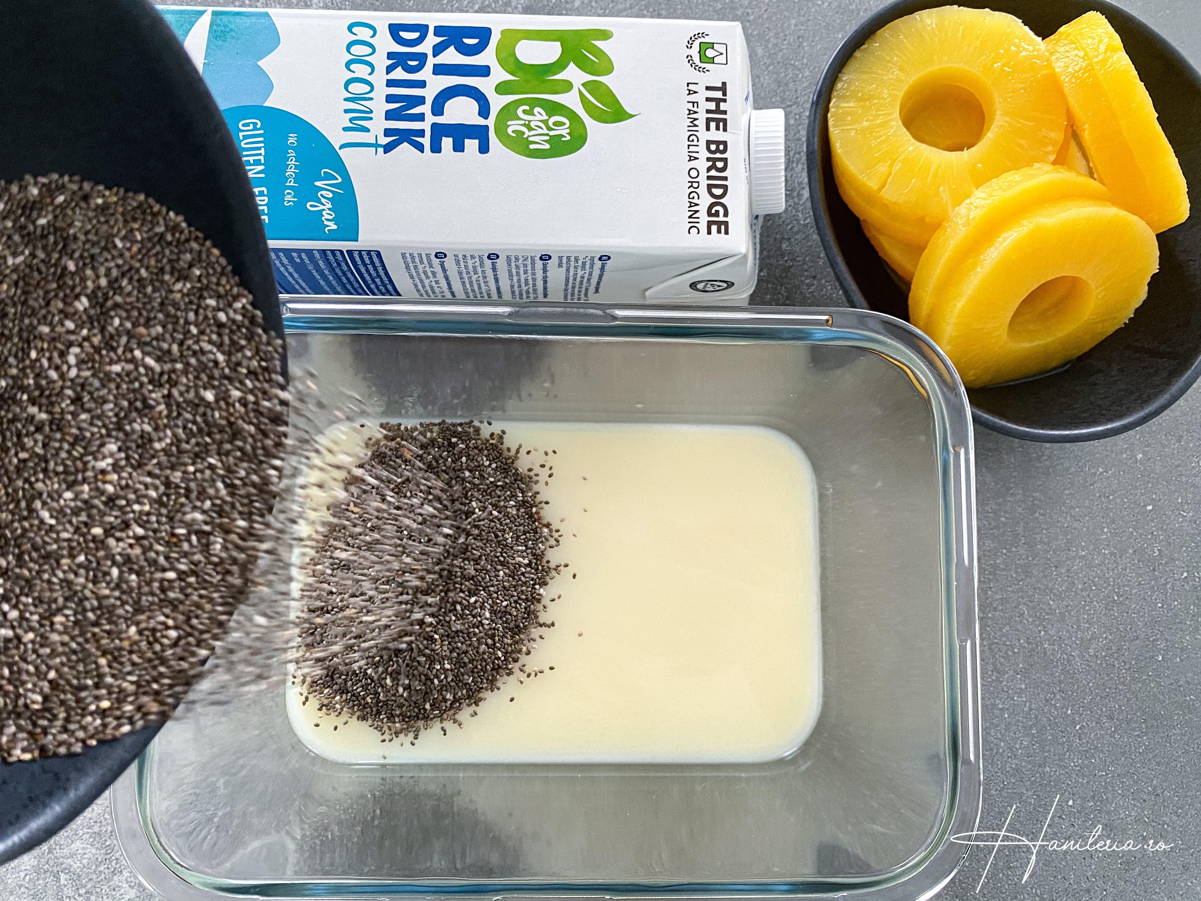 Eu azi am vrut să pregătesc mai mult un desert fructat și ușor, așa că nu m-am limitat doar la ananasul la conservă, ci am adăugat și câteva bucățele de banană, portocală, kiwi, smochină și fulgi chips de cocos. Am ales și un lapte de orez cu cocos, pentru a completa gustul exotic al fructelor folosite. Bineînțeles că puteți să folosiți, la fel de bine, orice alt lapte vegetal e pe gustul vostru. Eu trebuie să recunosc că la această budincă merg cel mai des pe două variante: fie lapte de orez cu cocos, fie lapte de orez cu gust subtil de vanilie.