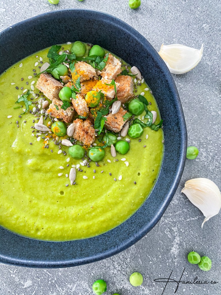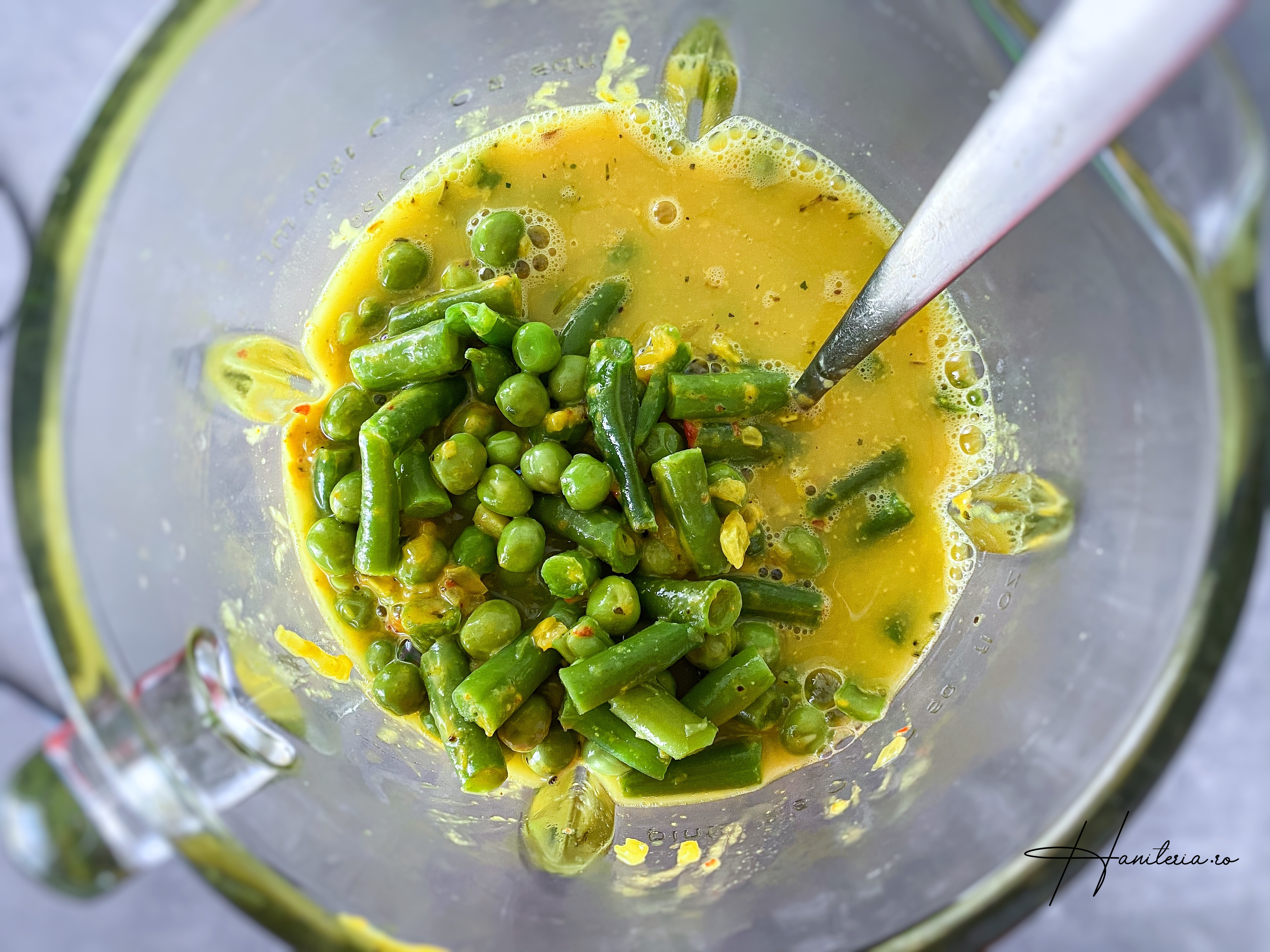 Azi am folosit un mix de mazăre și fasole verde, dar puteți la fel de bine să folosiți doar fasole verde. Nu săriți peste condimente, altfel supa cremă va fi destul de banală. Eu am folosit azi turmeric, care e un foarte bun antiinflamator și niște ierburi de Provence care dau acel mic plus ((busuioc 18%, maghiran 17%, rozmarin 16%, cimbrisor, salvie, oregano, cimbru, menta). Când folosiți turmeric, nu uitați să folosiți și piper negru măcinat, care potențează efectele antiinflamatoare ale turmericului.