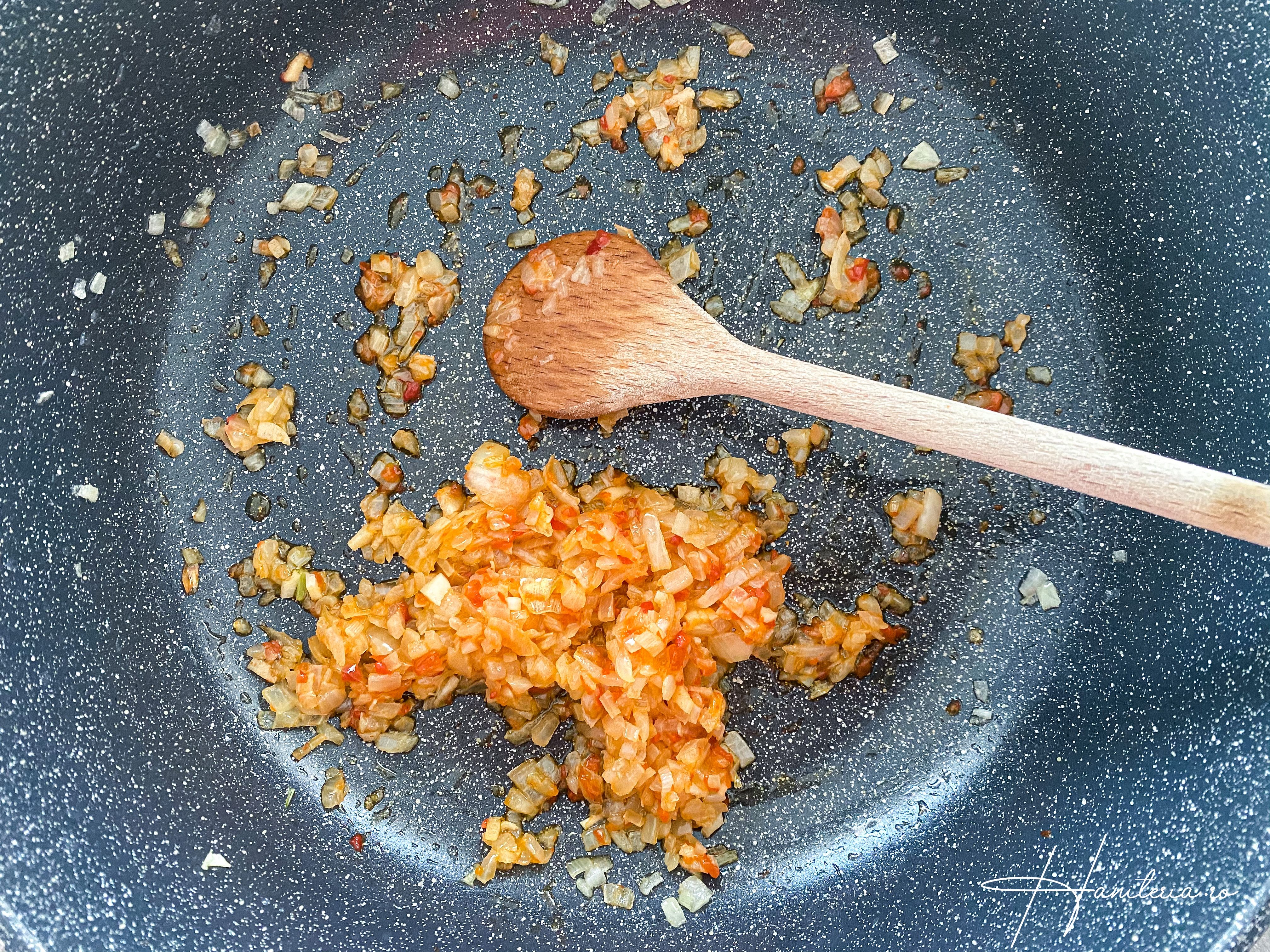 Am tocat ceapa mărunt și am pus-o la călit în cele două linguri de ulei. Am presărat și un praf de sare, pentru a ajuta ceapa să se inmoaie mai ușor. Când ceapa a devenit moale și translucidă, am adăugat și usturoiul tocat mărunt. Am mai lăsat 2 minute, după care am adăugat și pasta de ardei (sau ardei kapia tocat dacă asta folosiți).
