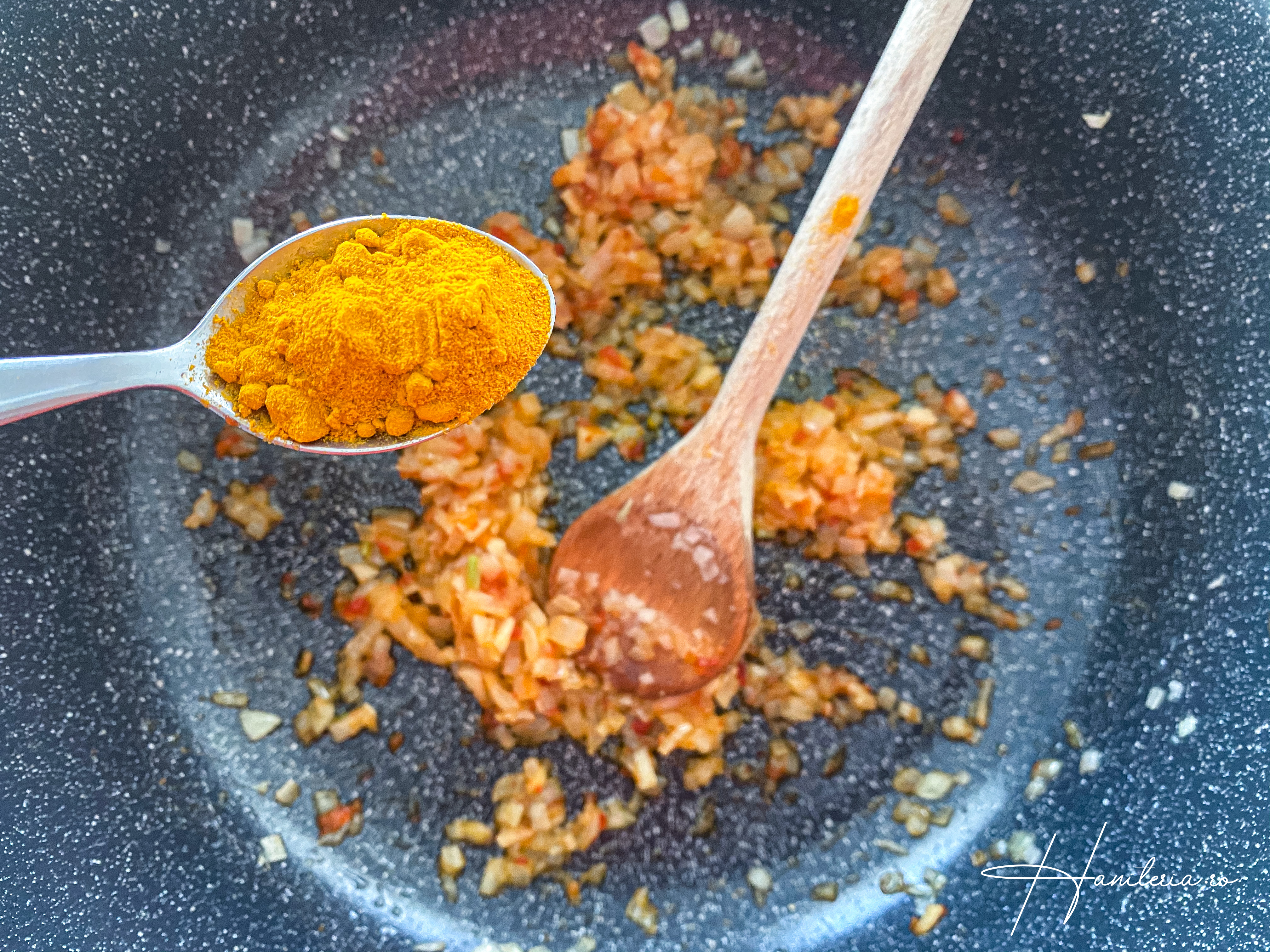 Când legumele s-au călit, am adăugat și lingurița de turmeric pudră.