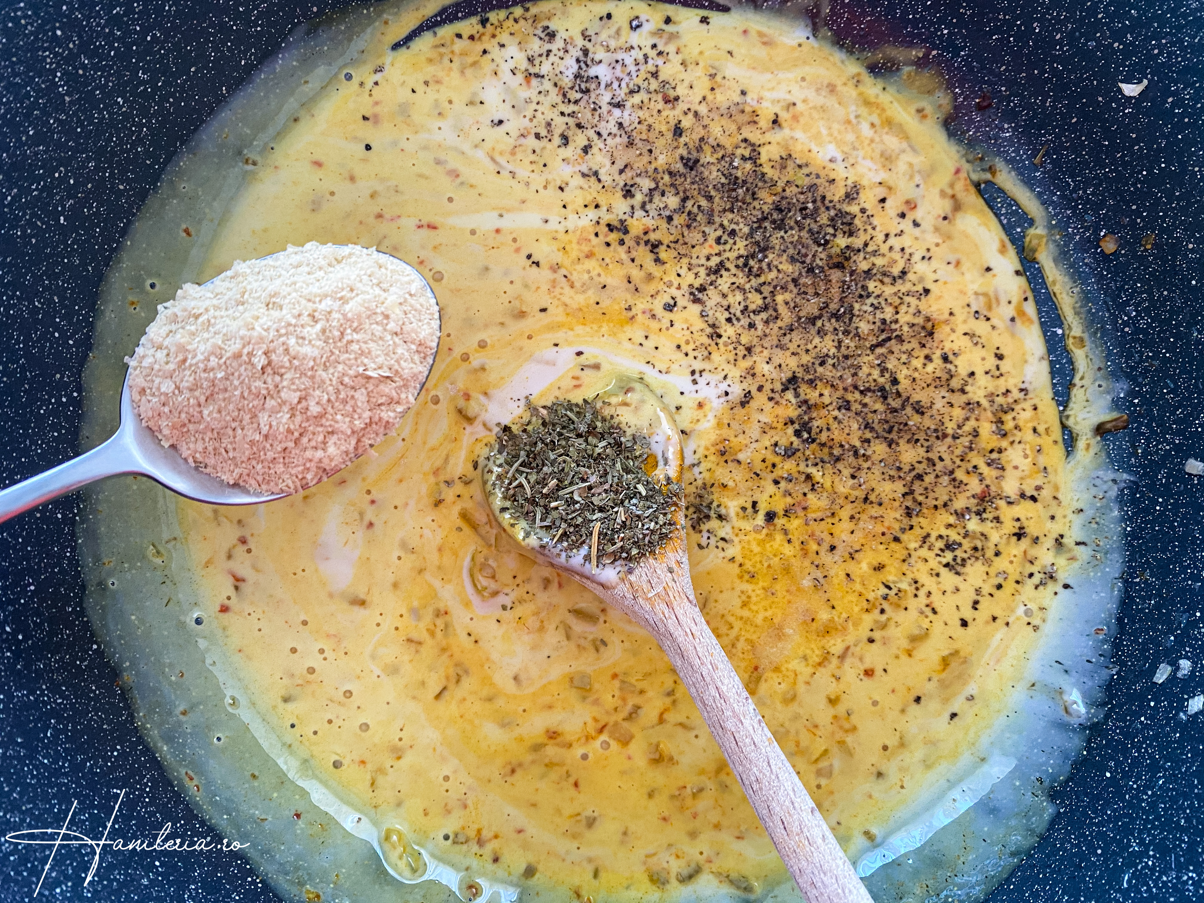 Am continuat cu condimentarea și am adăugat: ierburile de provence, piperul negru măcinat, fulgii din drojdie inactivă și sarea. Nu săriți peste ierburile de provence și restul condimentelor, pentru că altfel mâncarea o să aibă un gust destul de fad și banal. Am lăsat la fiert pentru încă 2-3 minute și am luat de pe foc.