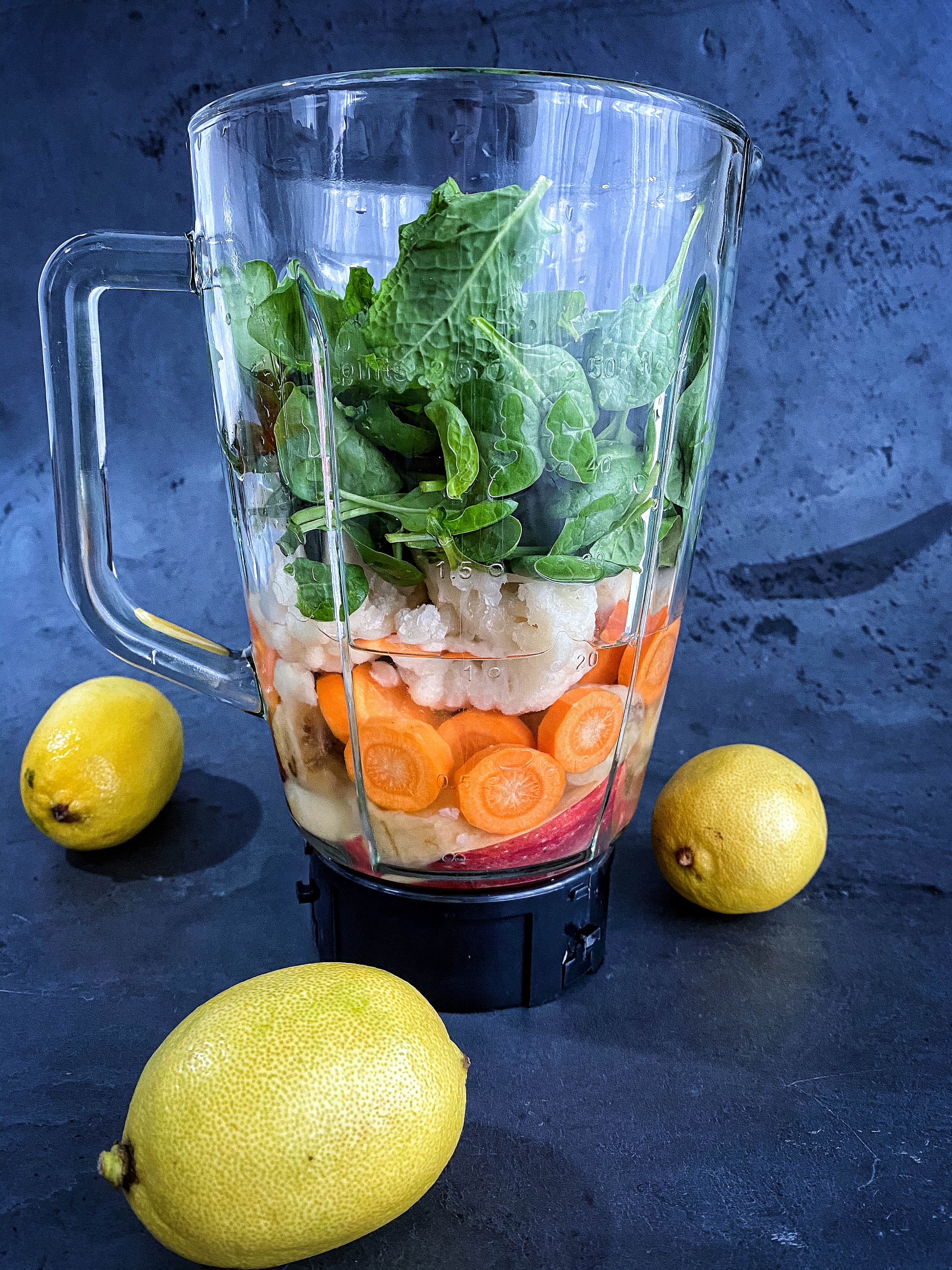 *Notă: folosiți banană congelată pentru o textură mai plăcută. Când banana e proaspătă consistența este mai gelatinoasă, puțin băloasă. Smoothie-ul se mixează mult mai bine dacă folosim gheață. Nu am mai adăugat gheață, având în vedere că am folosit banană și conopidă congelată.
