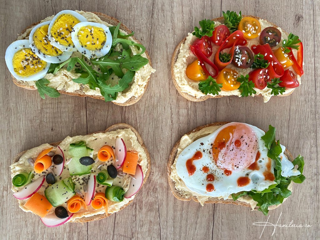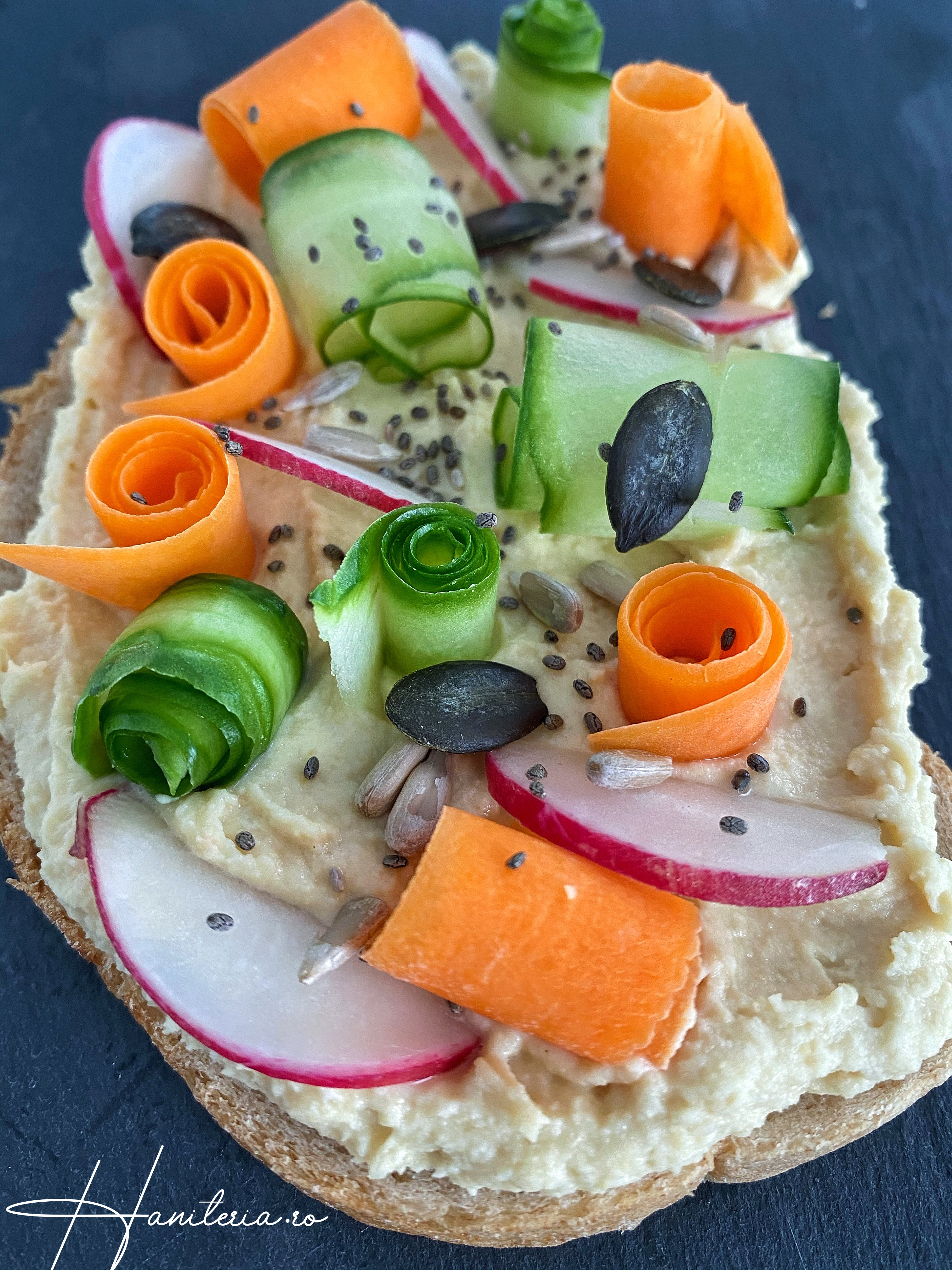 Hummusul poate fi servit în diverse combinații: fie cu felii de legume (morcovi , țelină, castraveți, etc), fie cu lipii integrale sau pe pâine integrală prăjită cu diverse toppinguri. O rețetă de hummus toast în 4 variante găsiți și la mine pe blog în link-ul de mai jos.