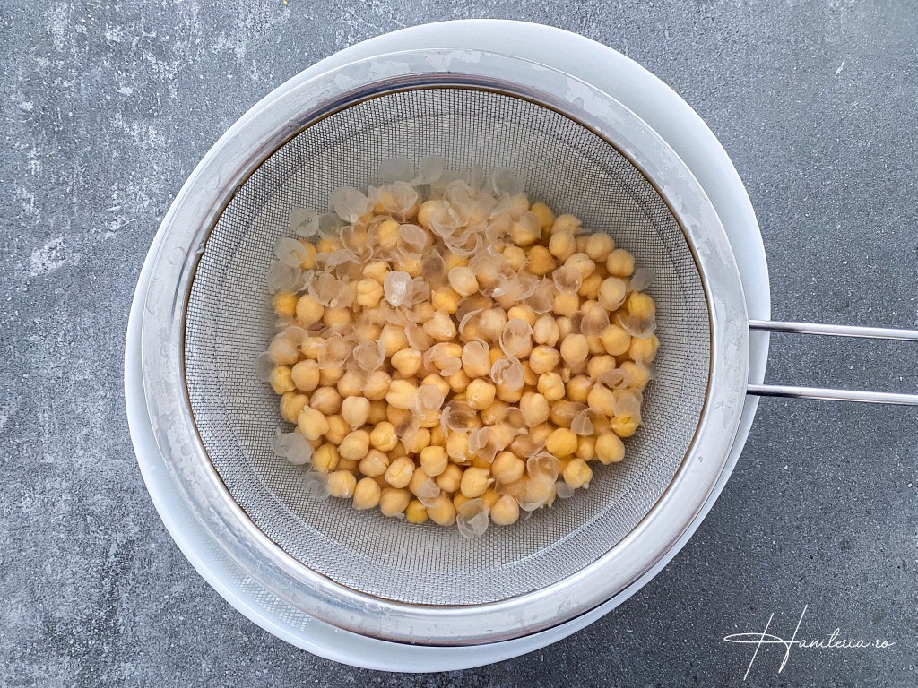 2 – Trântim boabele de năut într-o sită, pe care o adăgăm într-un vas cu apă. Începem să frecăm boabele de năut între palme. O să observăm că de pe năut încep să se desprindă niște coji, care încep să se ridice la suprafață. Începem să le pescuim și să le separăm.
