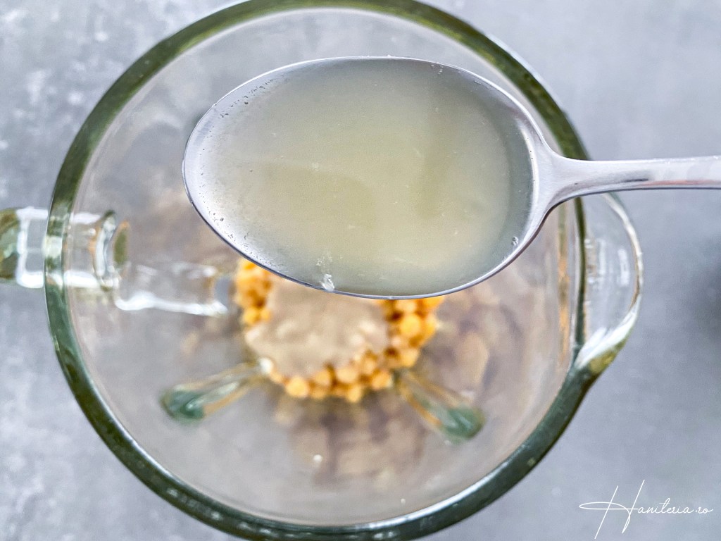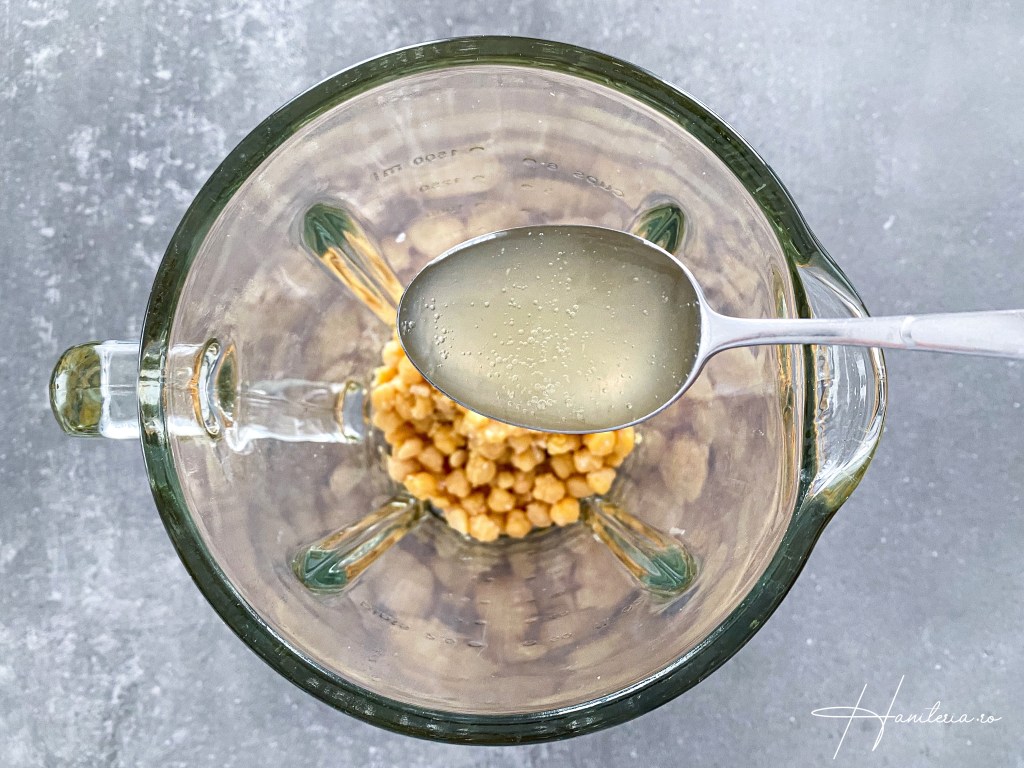 3 – Adăugăm cele 5 linguri de lichid de pe năut (se mai numește aquafaba).