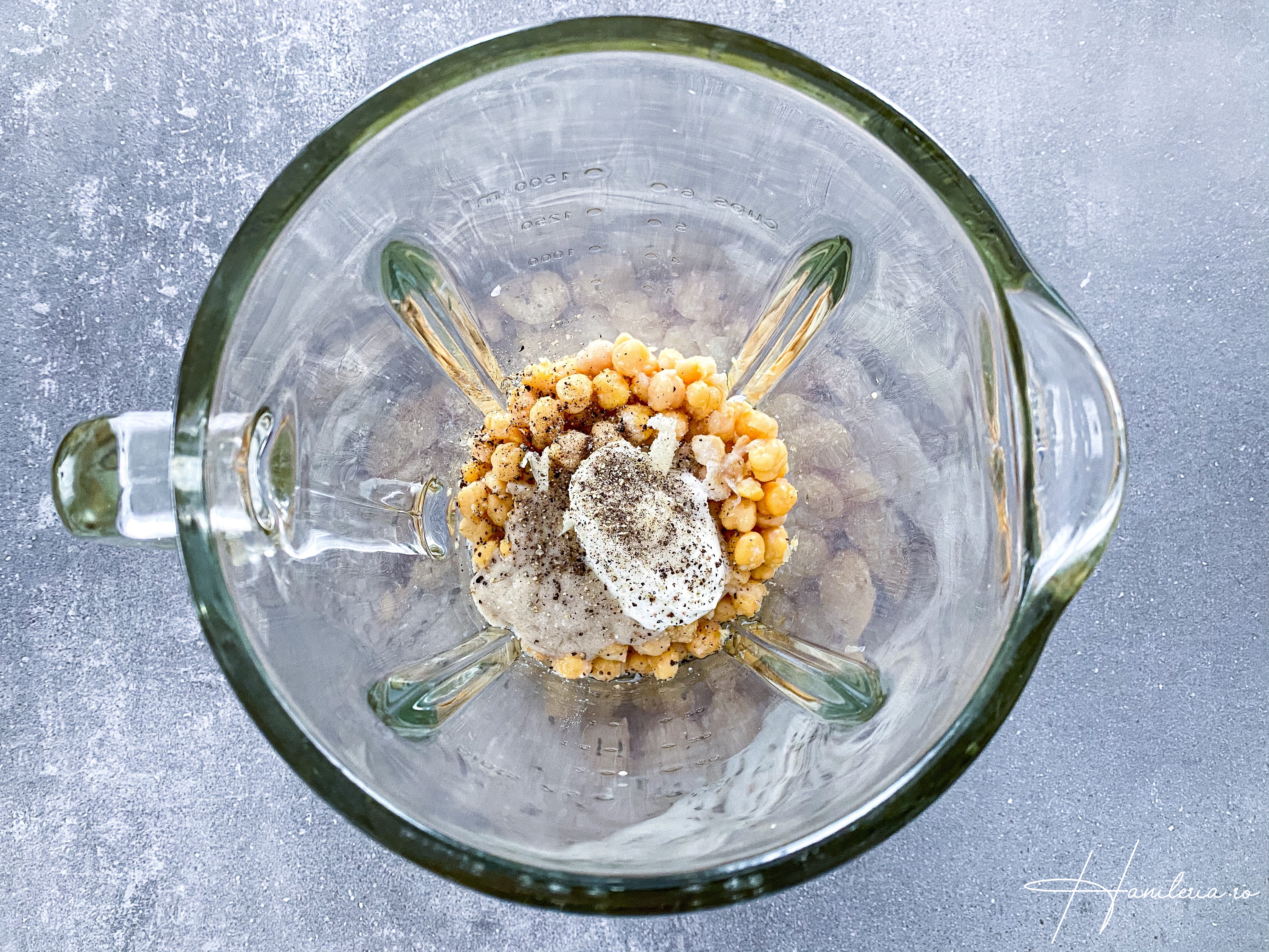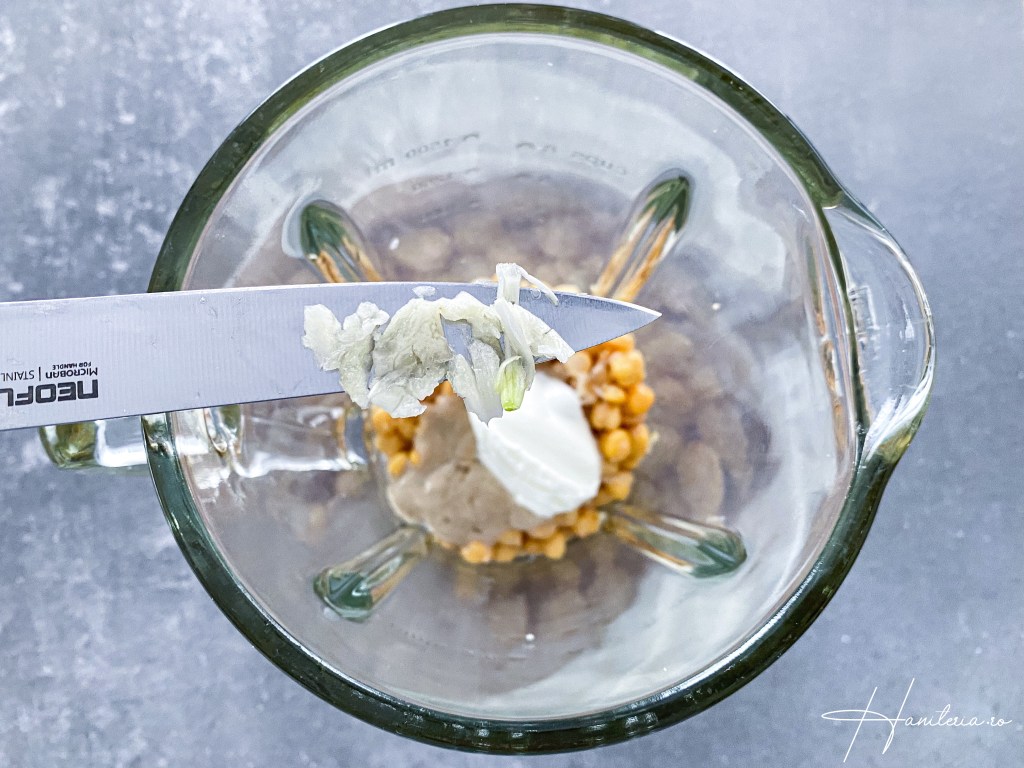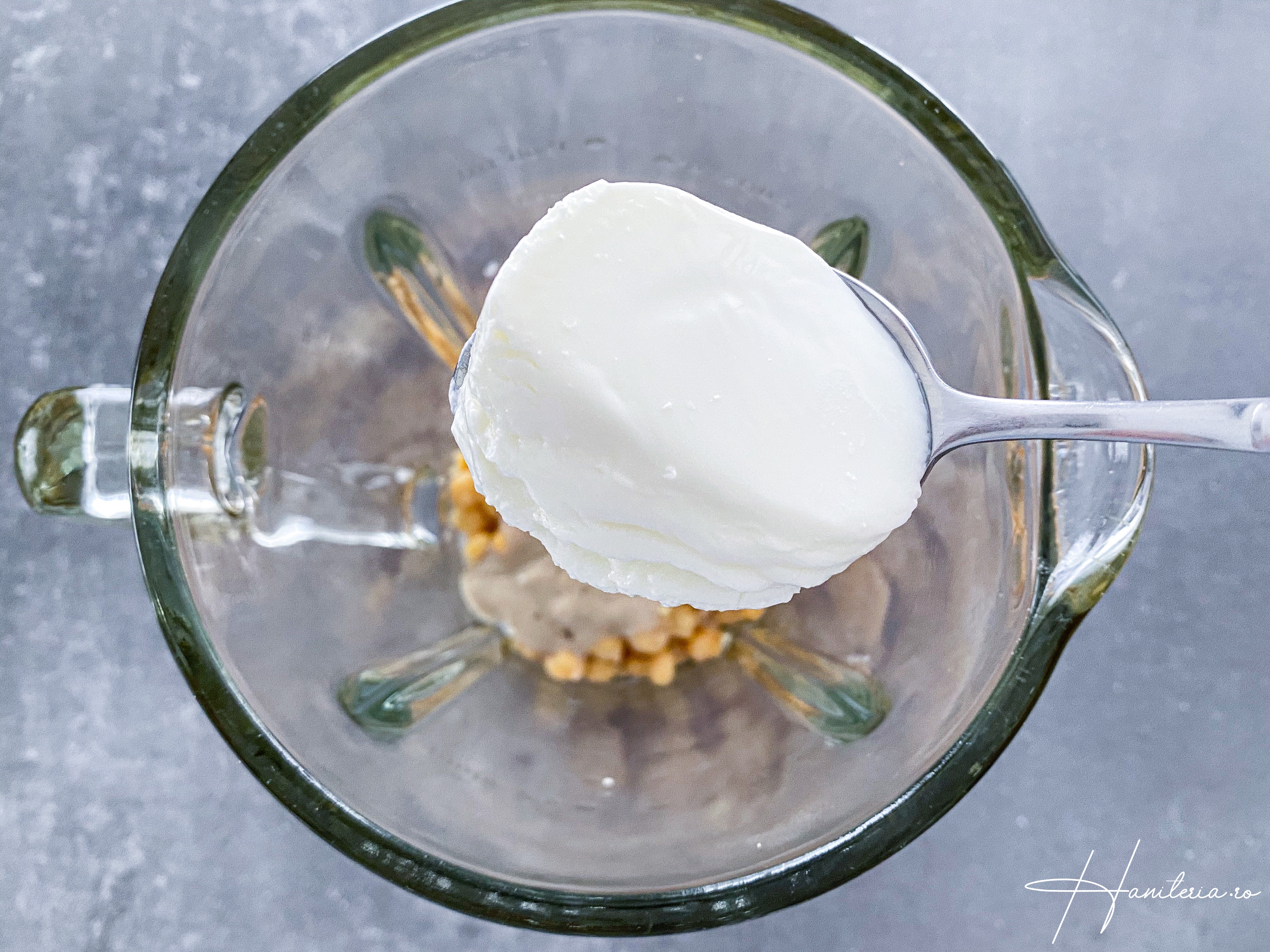 6 – Adăugăm 1 lingură de iaurt. Iaurtul îl folosim pentru a da cremozitate hummusului. În mod normal, pentru un hummus fin, mulți adaugă o cantitate semnificativă de ulei și pastă de susan. Noi trișăm puțin și folosim iaurt, pentru a elimina cantitatea de ulei folosită în mod normal. Acest truc l-am văzut într-o zi la o emisiune cu Jamie Oliver și l-am tot folosit de atunci.