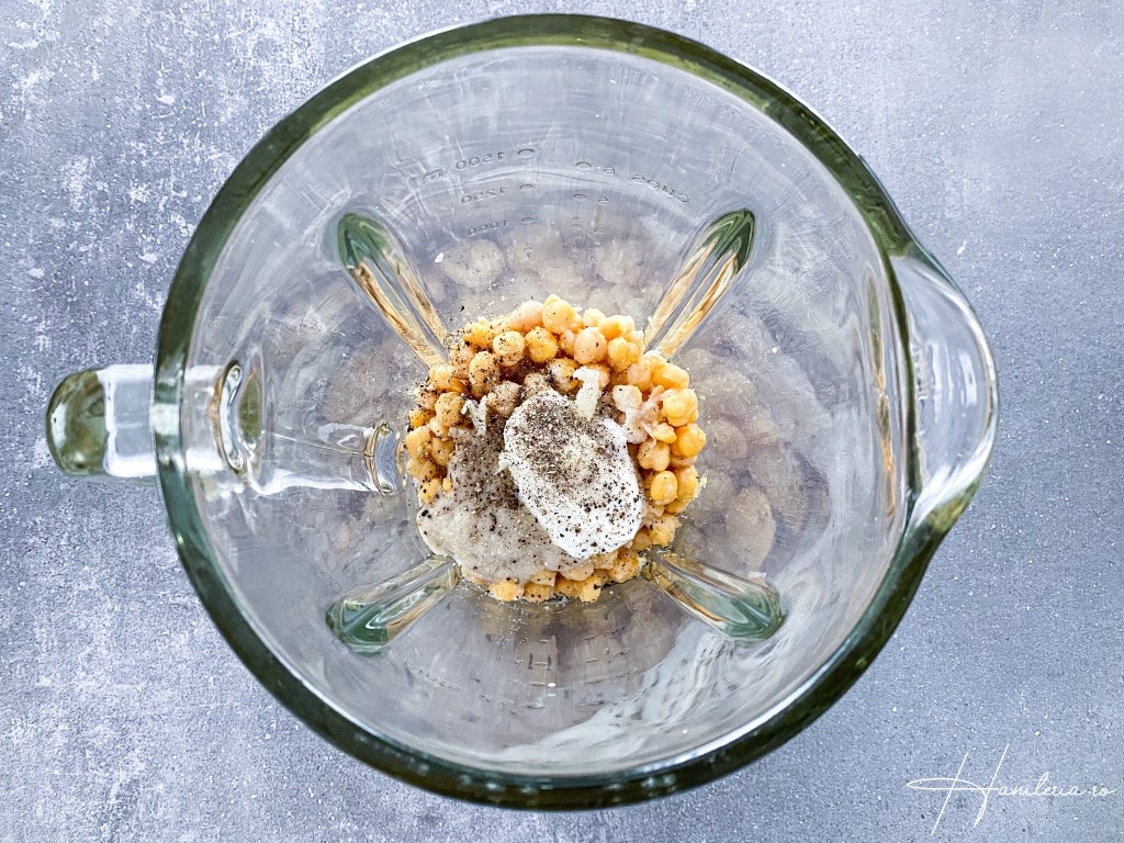 Se adaugă toate ingredientele într-un roboțel de bucătărie sau blender și se mixează până se obține o compoziție cremoasă și mătăsoasă. Inițial eu am mixat totul cu blenderul meu pentru smoothie, dar la final am mutat totul într-un miniroboțel de bucătărie, care a făcut compoziția mult mai omogenă și mai fină. E de preferat deci să folosiți din start un roboțel de bucătărie dacă aveți în dotare. Pentru a obține un hummus cât mai fin, cojile de pe boabele de năut se înlătură înainte de a le mixa.