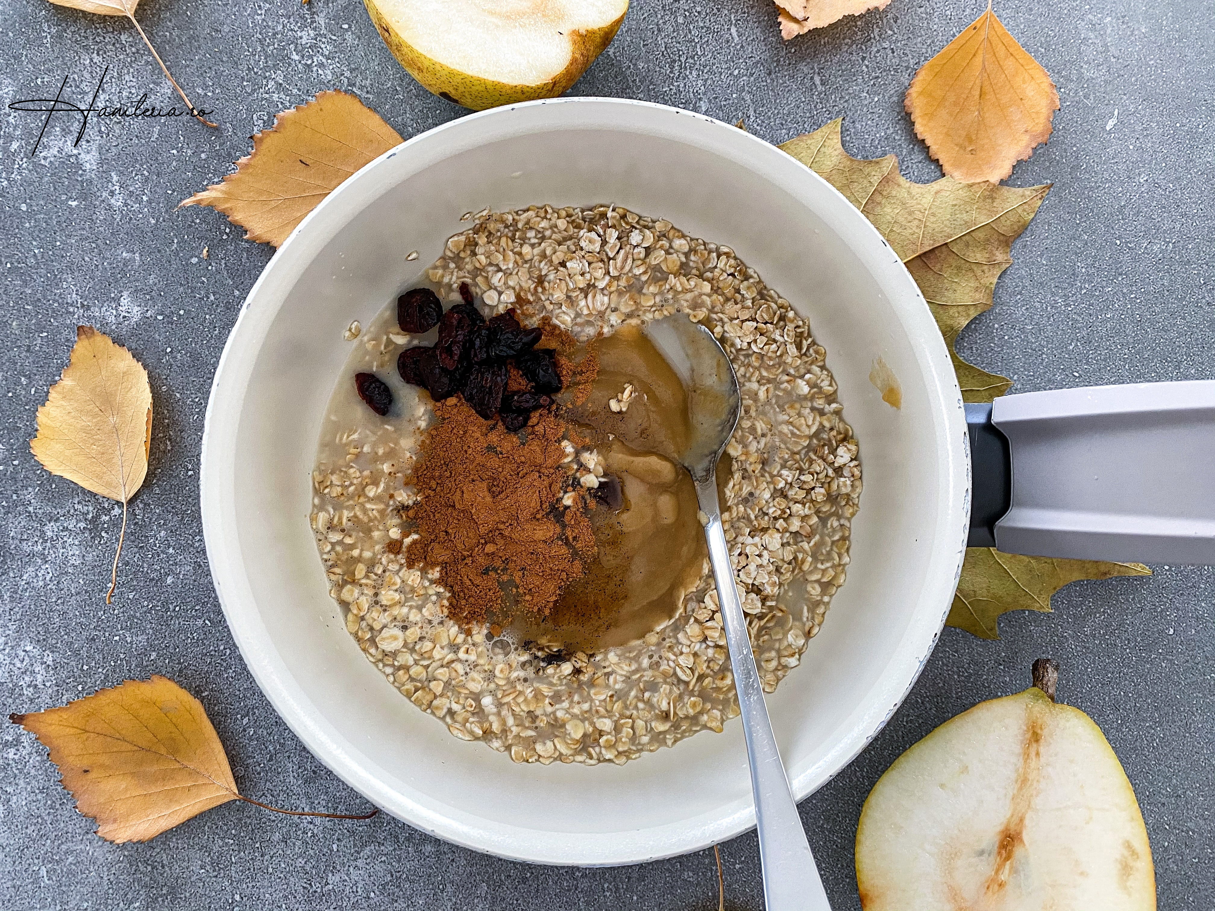 Într-o crăticioară ceramică antiaderentă adăugați fulgii de ovăz, laptele, piureul, scorțișoara, vanilia și merișoarele uscate (toate ingredientele, mai puțin para). În ceea ce privește piureul folosit, au fost dăți când am folosit piure de mere și pere și alte dăți când am folosit doar piure de mere. În ambele cazuri am fost mulțumită. Piureul de măr și pară mi s-a părut o idee mai dulce, dar ambele și-au făcut treaba cu succes.