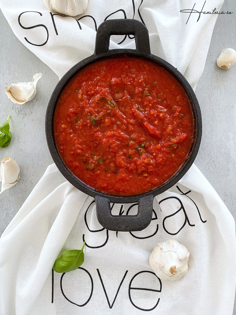 Trebuie să recunosc că sosul de roșii pentru paste îl primesc direct în sticluțe sigilate puse de mama pentru iarnă. Ea îl prepară cu roșii parfumate și cărnoase de grădină, cu usturoi, busuioc și alte mirodenii. Roșiile ei sunt acele roșii adevărate, muncite cu multă trudă în grădină, dar a cărui parfum și gust nu se compară cu nimic testat de mine prin magazinele și piețele din București. Așadar, nu aș putea să mă laud că pregătesc foarte des acest sos de roșii pentru paste, nu când am noroc cu o așa mamă. Până și soțul meu, care nu prea are mare drag de gătit, știe să își pregătească o porție de paste simple cu sosul ăsta miraculos. Tare m-am distrat într-o zi când a apărut la mine cu o față crispată și m-a anunțat că s-a terminat, sosul nu mai e și din cauza asta el a terminat-o cu pastele. A spus că fără sosul de la mama, el nu mai știe să pregătească paste (C’est fini la comedie – no sos, no paste). Rețeta de azi îi e așadar dedicată soțului meu, să aibă și el la îndemână o variantă extrem de simplă și rapidă a unui sos de roșii cu usturoi și busuioc. E un sos potrivit când nu ai la îndemână roșii proaspete și aromate. Nu o fi el la fel de bun ca sosul mamei, dar e aromat cu usturoi, busuioc, rapid și foarte util în bucătărie la tot felul de rețete, nu doar pentru paste. Este un sos marinara, așa că să îi dăm drumul cu rețeta.