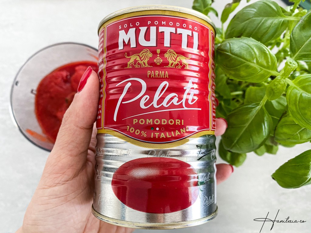 - 2 cutii x 400g roșii întregi decojite în suc de tomate (am folosit Mutti Pelati) *vezi Notă