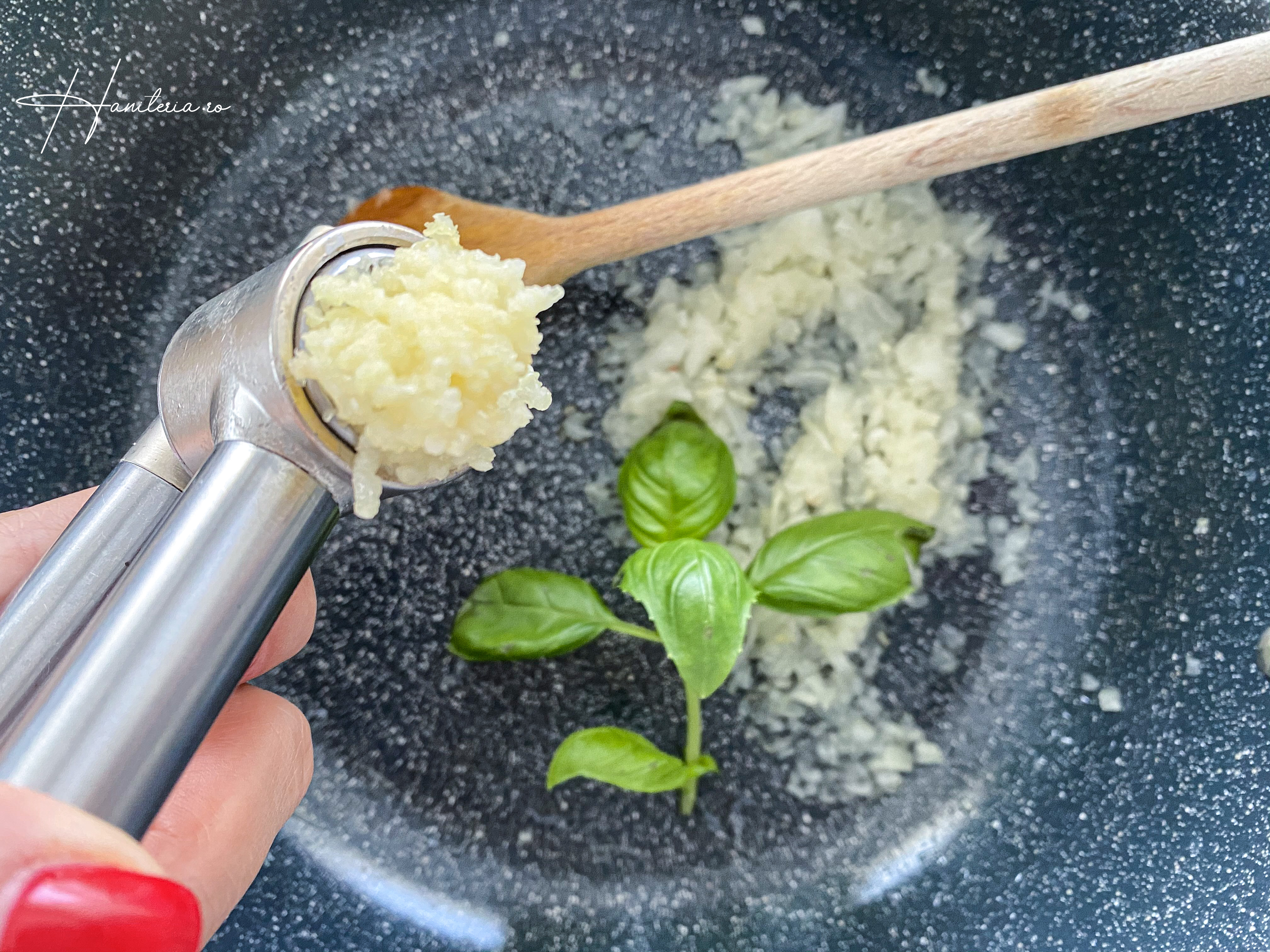 2. Când ceapa s-a înmuiat și este translucidă, adăugați usturoiul pisat cu presa și o crenguță de busuioc cu câteva frunzulițe. Prăjiți un minut- două. Amestecați încontinuu și căliți la foc mic, având grijă ca ceapa și usturoiul să nu se ardă. Acum e momentul să adăugați si ardeiul iute sau fulgii de chili, dacă folosiți.
