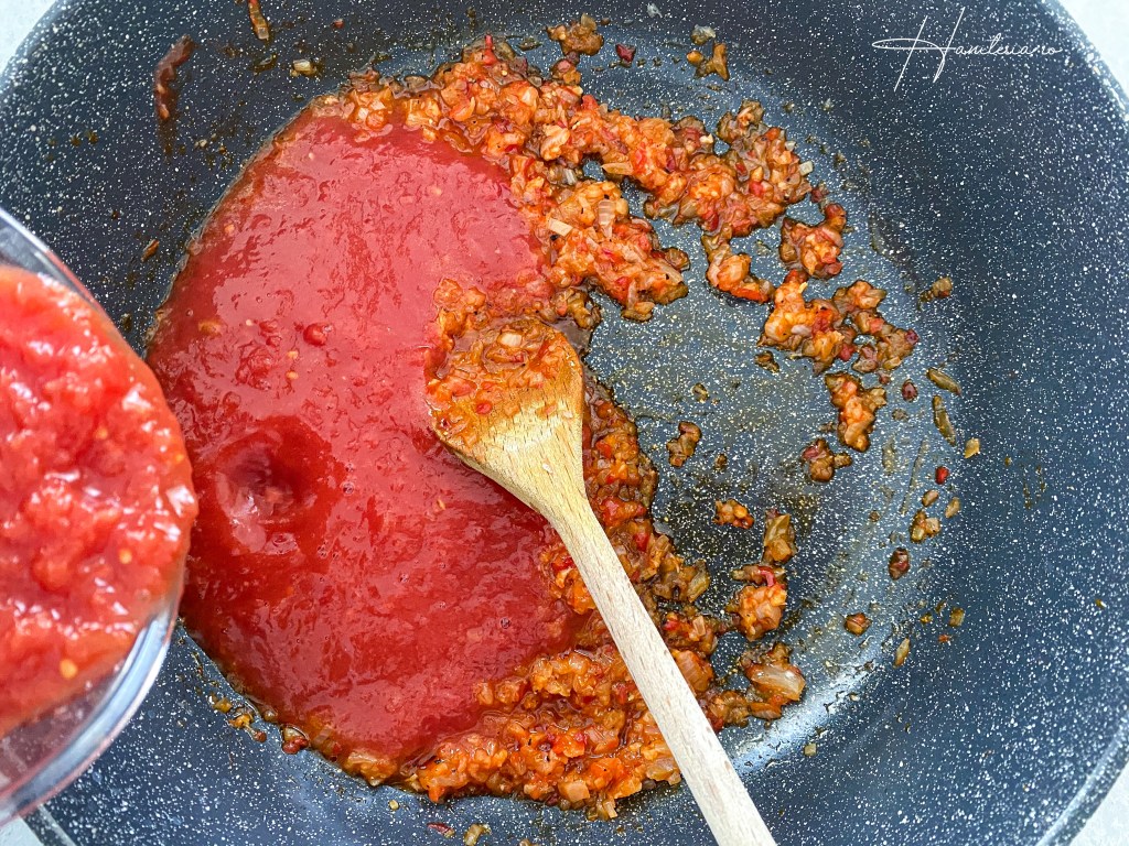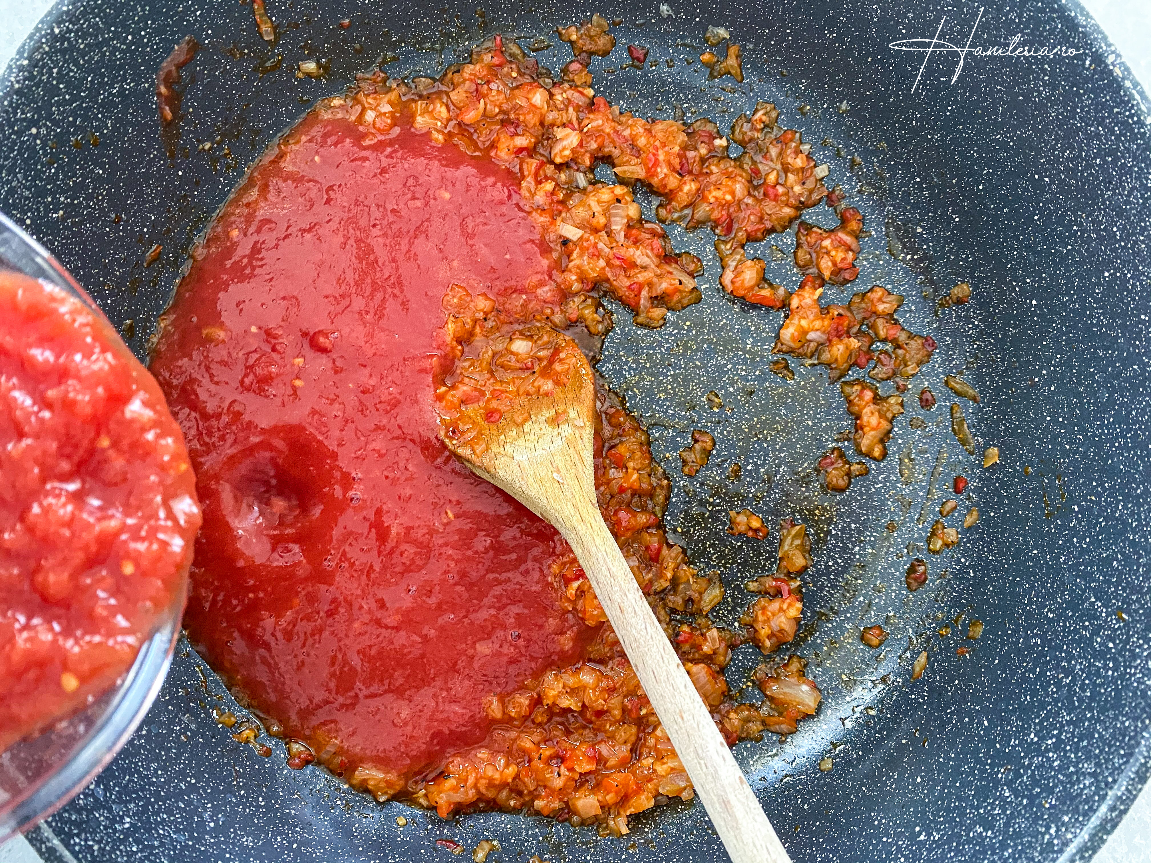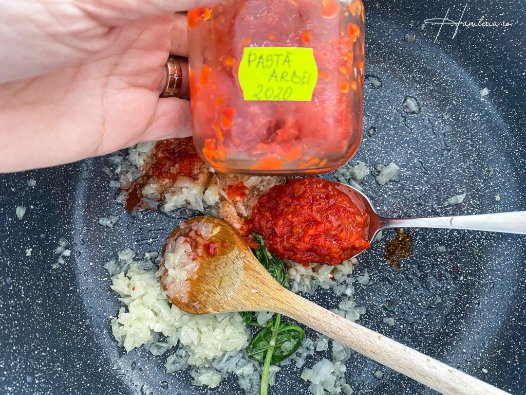 3. Adăugați și pasta de ardei de casă. Dacă nu aveți, atunci folosiți o lingură de ardei roșu tocat foarte mărunt, spre pastă, cu un roboțel de bucătărie. Mai prăjiți totul un minut – două la foc mic. Înlăturați crenguța de busuioc la final.