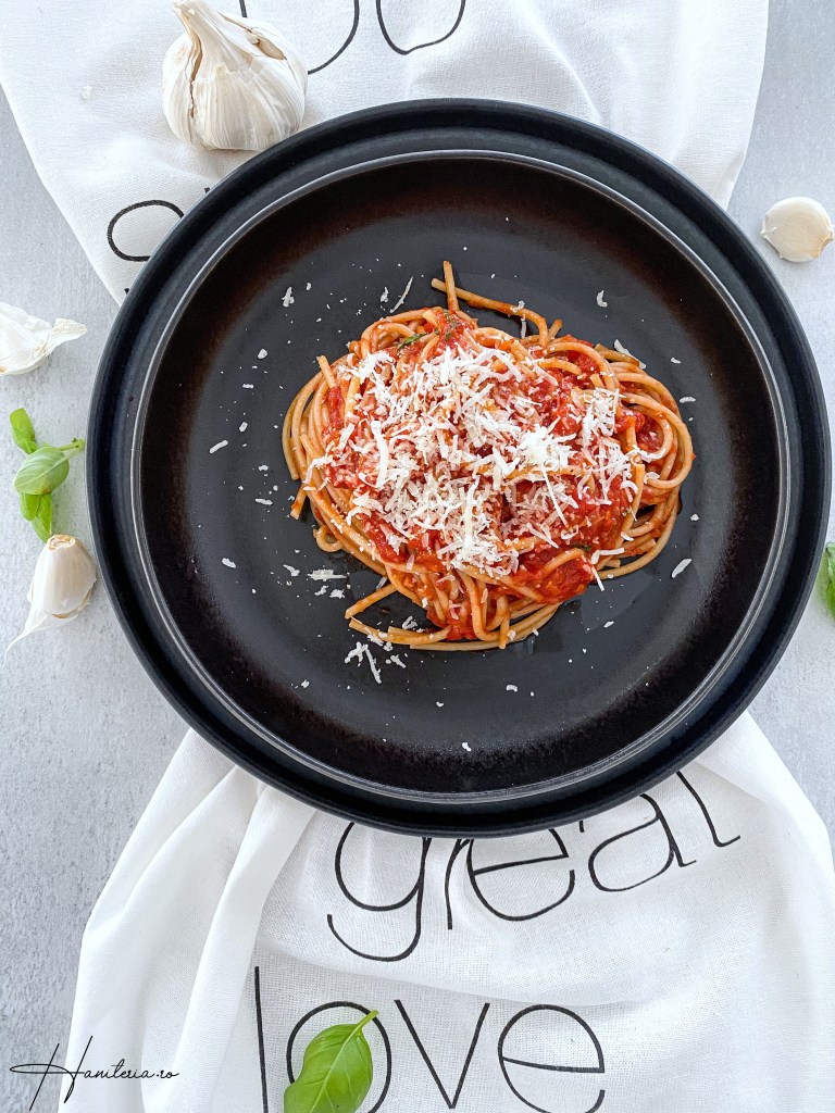 Și dacă tot am pregătit rețeta de sos roșu cu usturoi și busuioc, am zis să încropim cu el și o banală rețetă cu paste integrale. Dacă aveți cumva și sosul de roșii pregătit din timp, rețeta este gata în câteva minute și trei mișcări. Pastele sunt la libera alegere, pot să fie din făină integrală sau pot să fie din năut, quinoa, linte roșie, mazăre verde, etc. Eu azi am pariat pe niște spaghete clasice din făină integrală, pentru că asta aveam la îndemână. Este o rețetă năucitor de simplă, fără prea mari pretenții, dar care este surprinzător de gustoasă prin simplitatea ei.