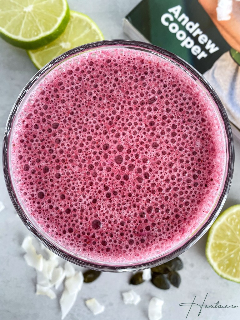 Dacă ultimul smoothie pe care vi l-am prezentat era o combinație proprie, rețeta smoothie-ului de azi este preluată din cartea Juicemen, scrisă de Andrew Cooper. Este o carte cu peste 100 de rețete de sucuri aromate, smoothie-uri și câteva preparate sănătoase. Smoothie-ul de azi conține afine, nuci și semințe, grăsimi cu conținut nutrițional ridicat, despre care Mr Juiceman susține că ar fi benefice pentru ten.