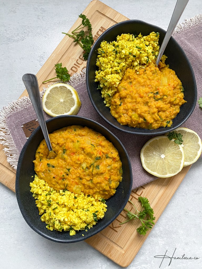 Eu azi am savurat acest orez fals din conopidă alături de un curry de linte roșie și dovlecel. Pe blog am deja postată o rețetă de curry cu linte roșie și năut pe care puteți să o folosiți. Găsiți rețeta în link-ul de mai jos: