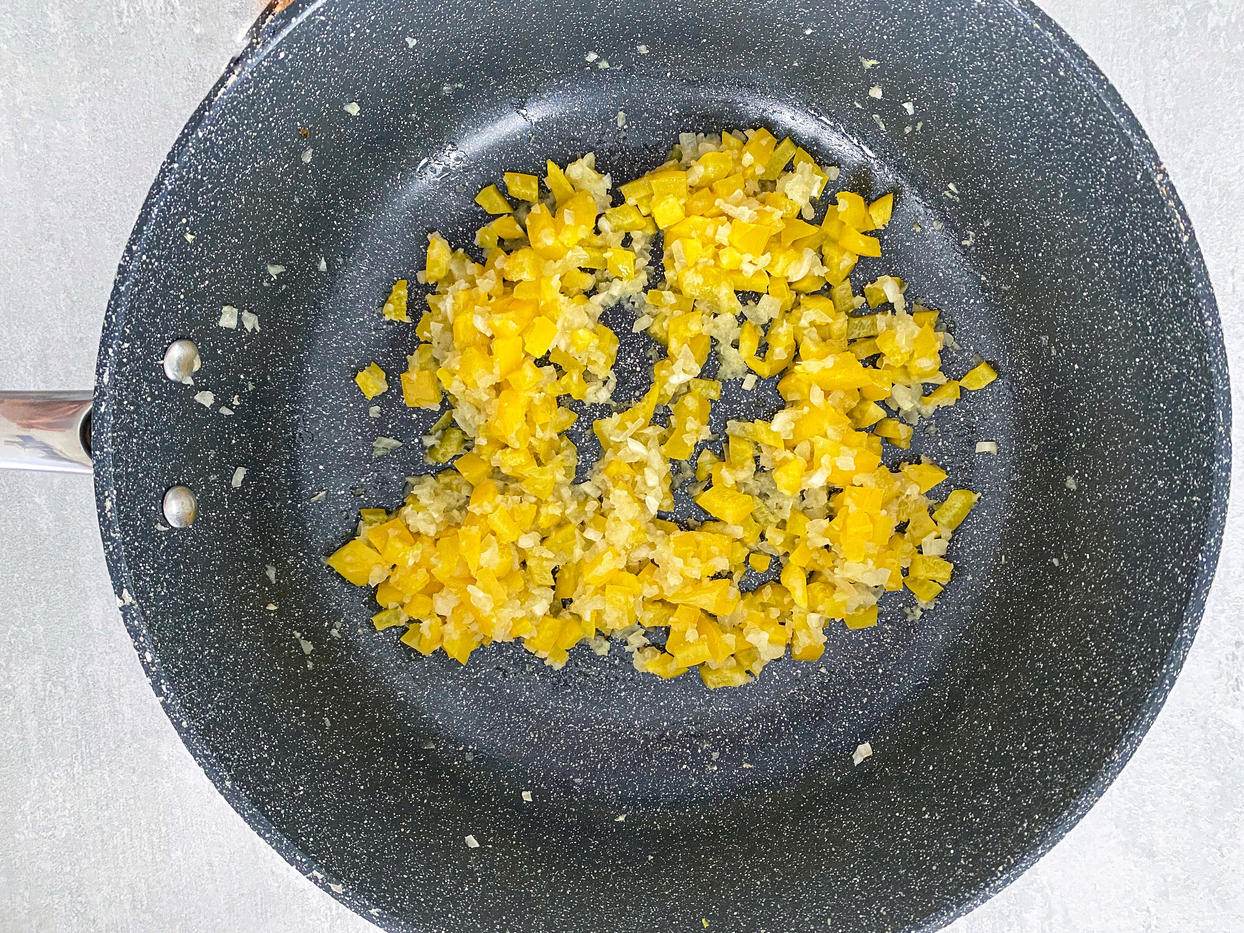 2. Se călește ceapa tocată mărunt cu puțină sare în cele două linguri de ulei, până se înmoaie și devine ușor translucidă. Se adaugă usturoiul și ardeiul tocate mărunt.