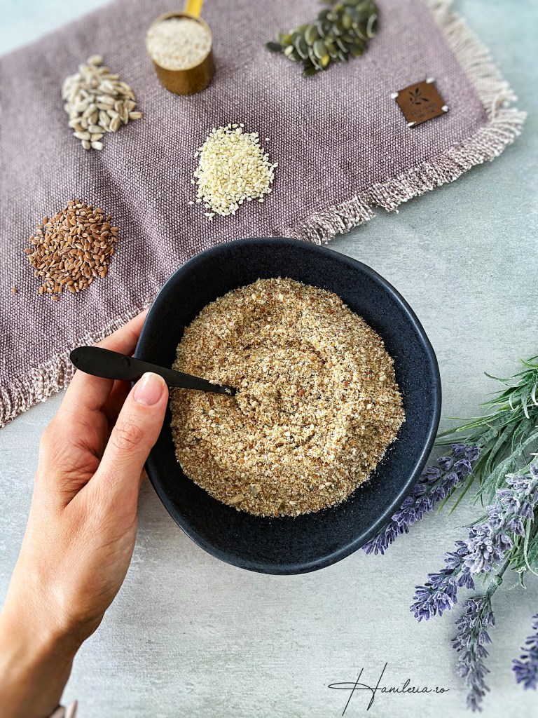 Așa cum spuneam la început, acest superamestec de semințe se păstreaza foarte bine într-un borcan închis ermetic (în loc uscat și răcoros sau la frigider) și poate fi folosit cu succes în tot felul de combinații: în iaurt, presarat peste salate, supe cremă, smoothie-uri, toast-uri cu avocado, hummus, etc.