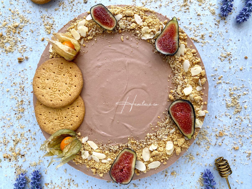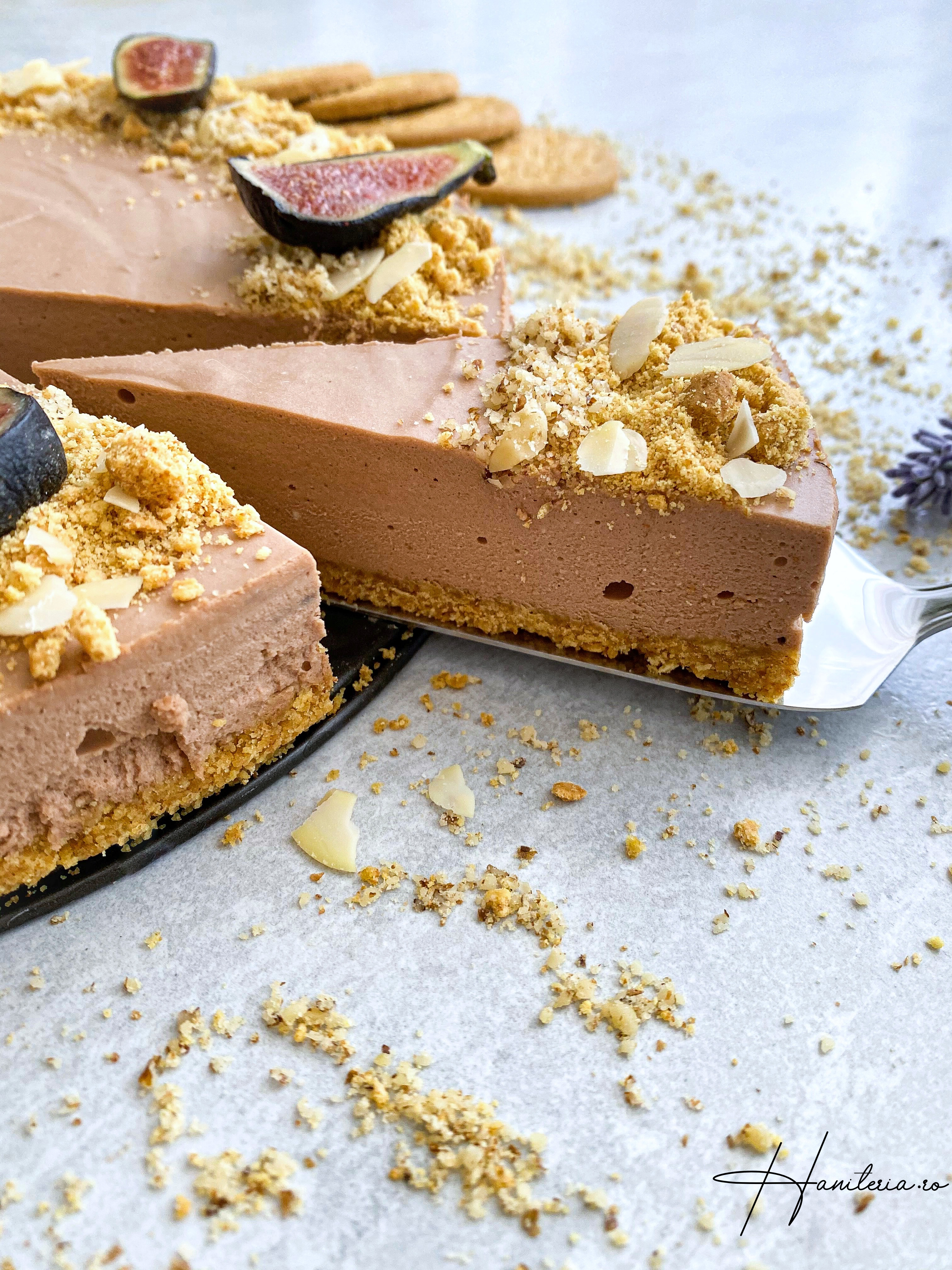 Rețeta acestui cheesecake este „furată” de la nimeni alta -pregătiți tobele- mama mea. Ea pregătește acest desert la ocazii speciale pentru tatăl meu care suferă de diabet. Nu este vreun desert super dietetic, dar este unul fără zahăr adăugat, cu multă ciocolată și biscuiți digestivi cu îndulcitori. Bineînțeles că și nouă ne-a plăcut foarte mult, așa că tatăl meu s-a trezit cu concurență serioasă la înfulecat. Dar nu e cu supărare, pentru că el oricum nu și-ar fi permis să dea gata un cheesecake întreg de unul singur. Așa cum v-am obișnuit, să încetăm cu vorbărie multă și să purcedem cu rețeta.