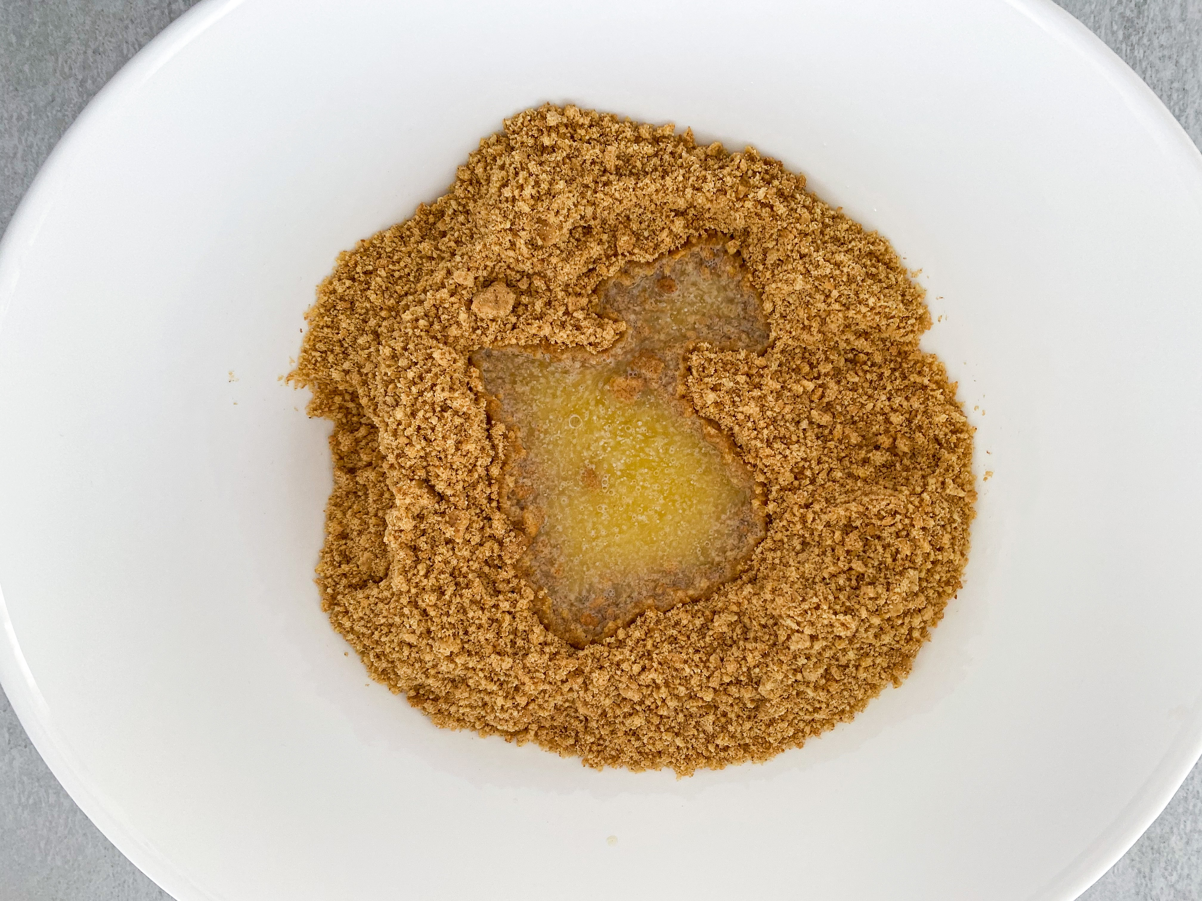 3. Adăugați untul topit peste biscuiții zdrobiți. Cu mâna frământați ușor compoziția.