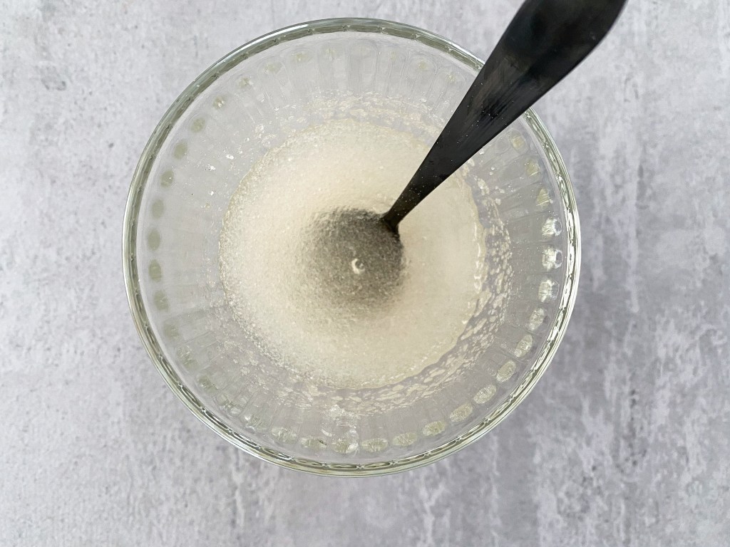 6. Puneți gelatina + 100 ml de apă într-un pahar. Lăsați gelatina la hidratat pentru aproximativ 10 minute.