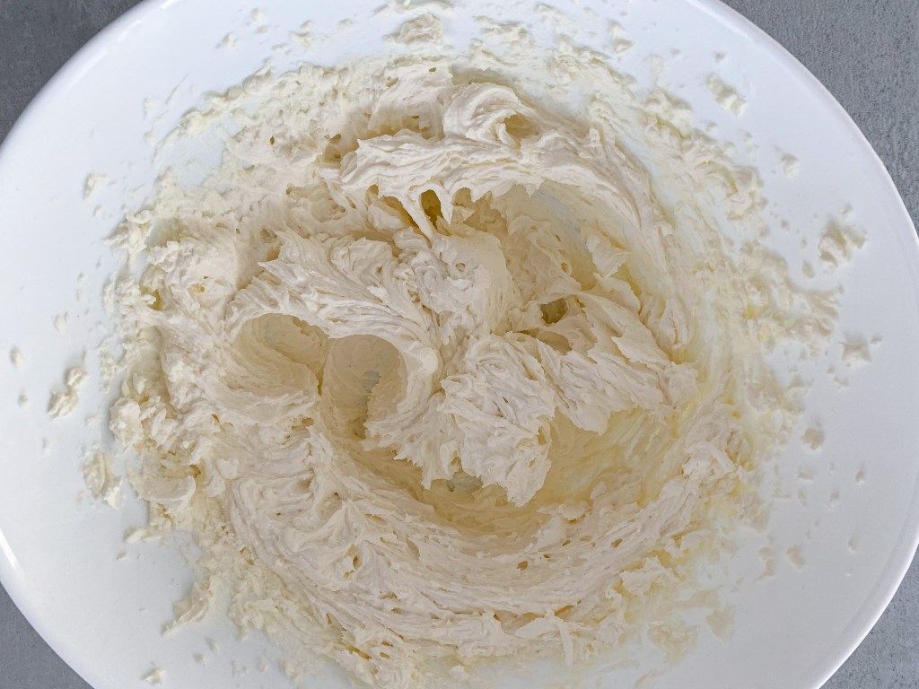 7. Într-un castron puneți brânza mascarpone, brânza ricotta, lingura de îndulcitor* și esența naturală de vanilie. E de preferat ca brânzeturile să fie ușor la temperatura camerei și nu proaspăt scoase din frigider. Mixați (cu un mixer) foarte scurt compoziția, până devine ușor spumoasă.