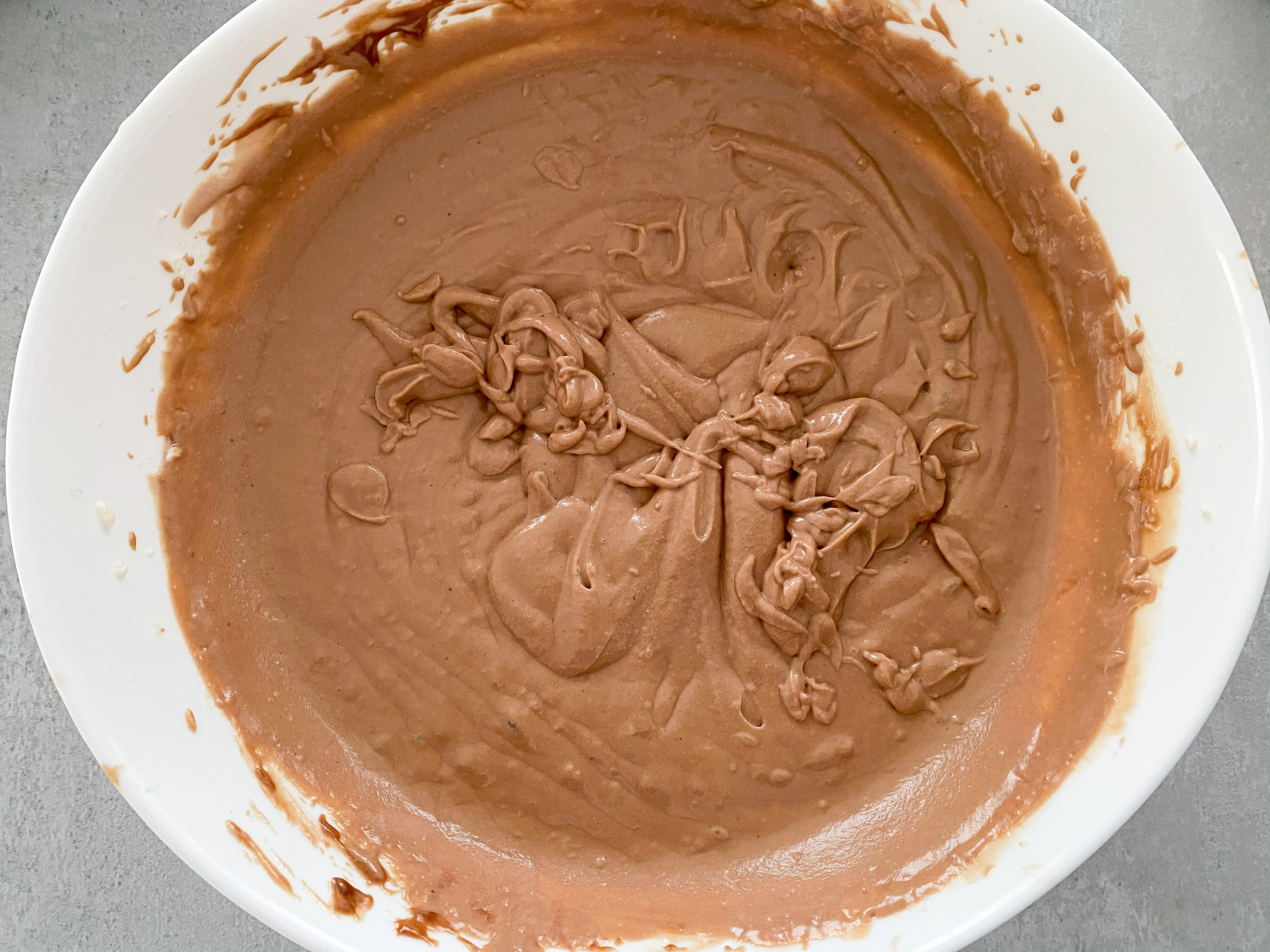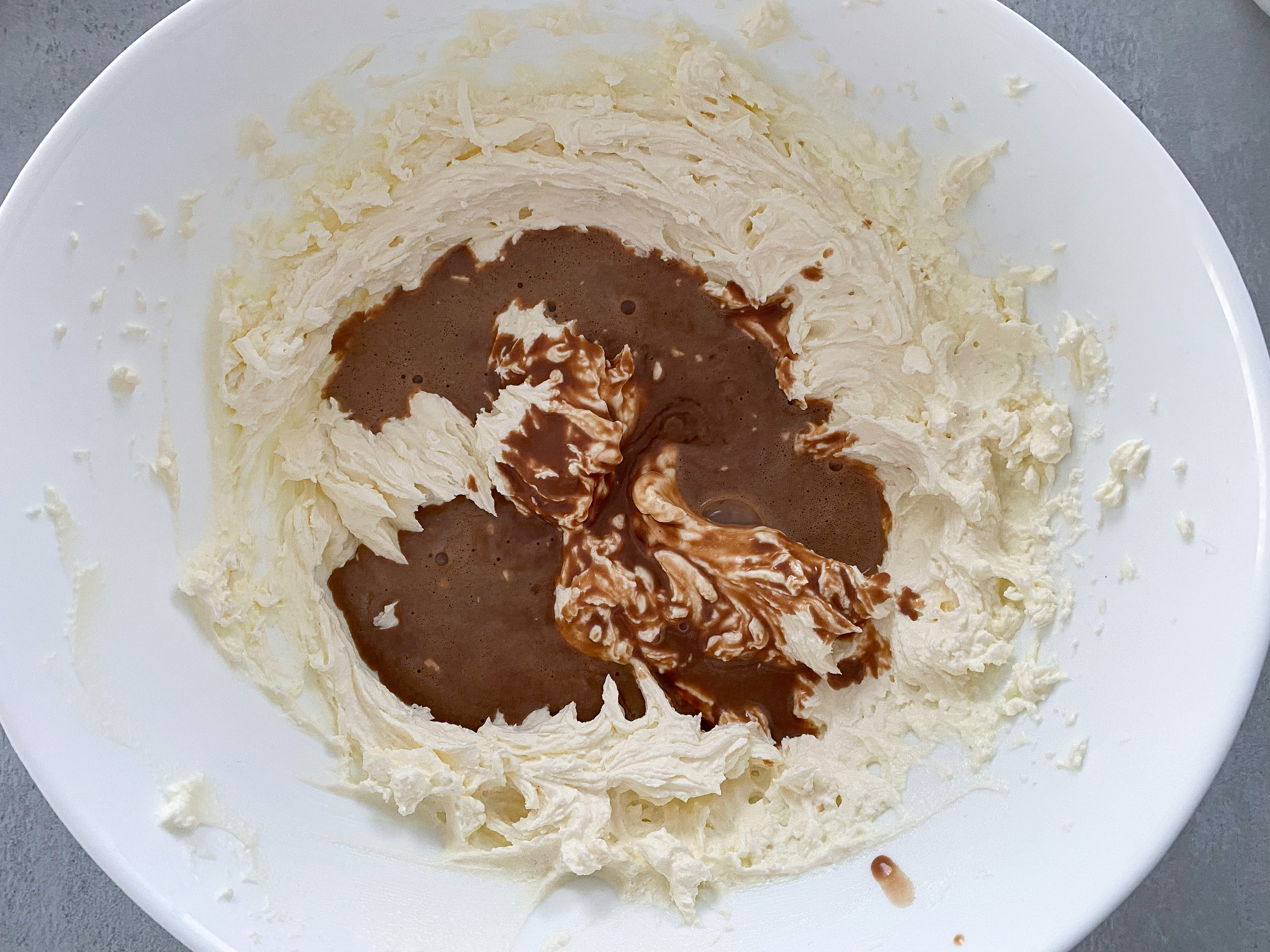 10. Adăugați și restul de cremă de smântână cu ciocolată. Mixați cu un mixer compoziția pentru aproximativ 1 – 2 minute. O să obțineți o cremă ușor moale.