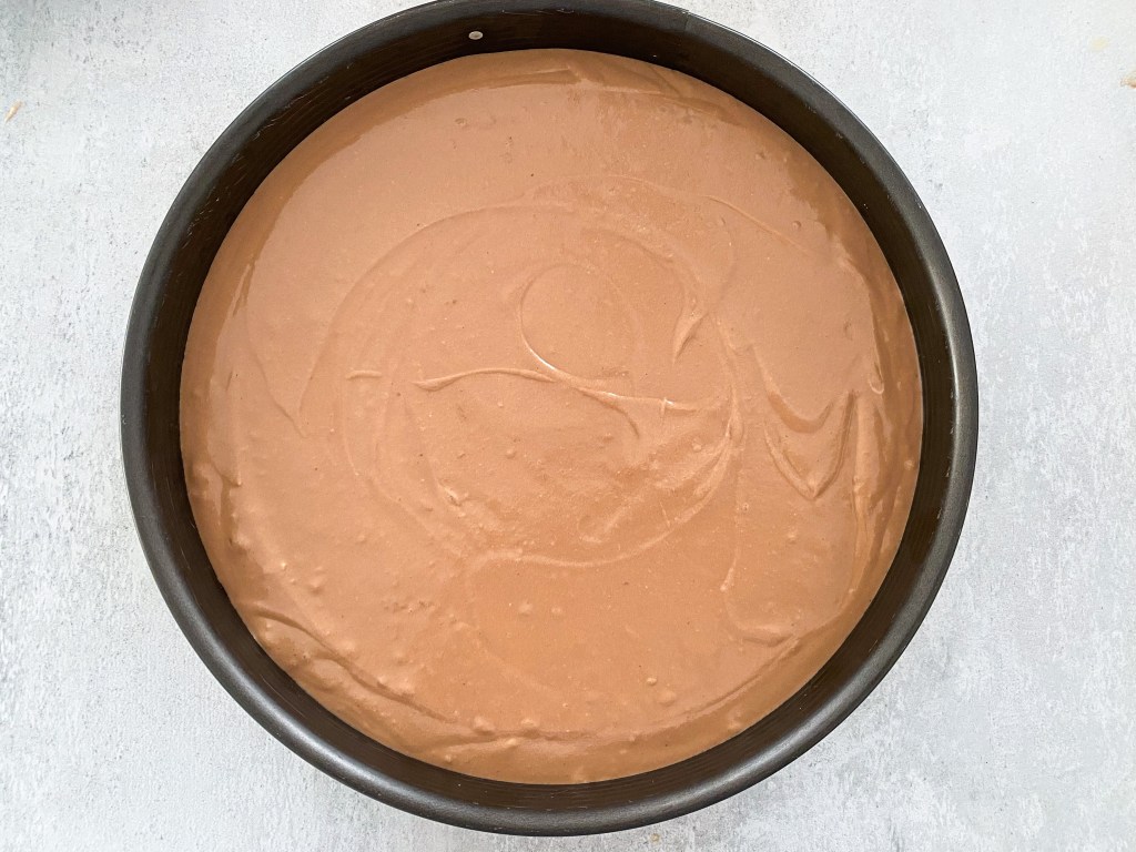 11. Turnați crema în tavă peste amestecul de biscuiți. Nivelați ușor și trantiți ușor tava de vreo 2-3 ori de masă, pentru ca amestecul să se așeze și să scăpați de bulele de aer.