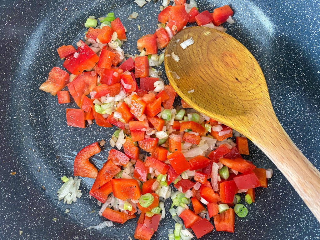 1. Tăiați mărunt ceapa galbenă și partea albă de la ceapa verde. Căliți-le ușor în cele 2 linguri de ulei. După un minut – două adăugați și ardeiul kapia tăiat cubulețe și usturoiul tocat mărunt. Adăugați puțină sare. Prăjiți pentru câteva minute.