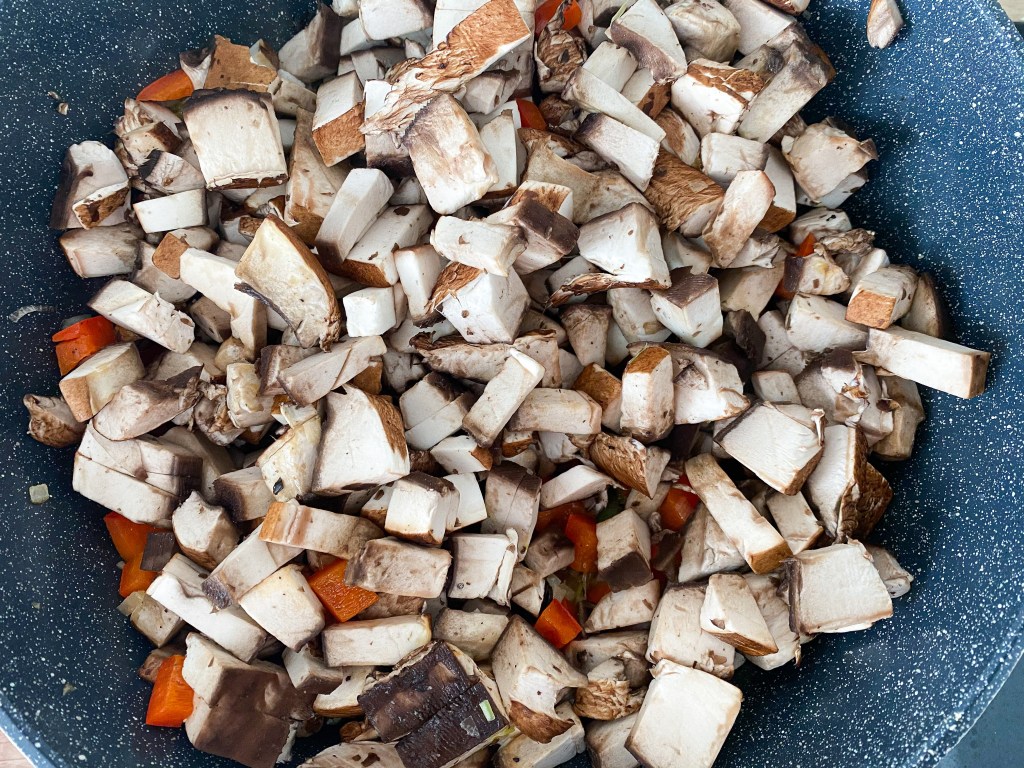 2. Curățați ciupercile cu o perie uscată și cu un șervet înmuiat ușor în apă. Nu le scufundați în apă, că o să o absoarbă ca un burete. Tăiați ciupercile cubulețe și adăugați-le în tigaie la prăjit. Mai adăugați puțină sare și piper proaspăt măcinat.