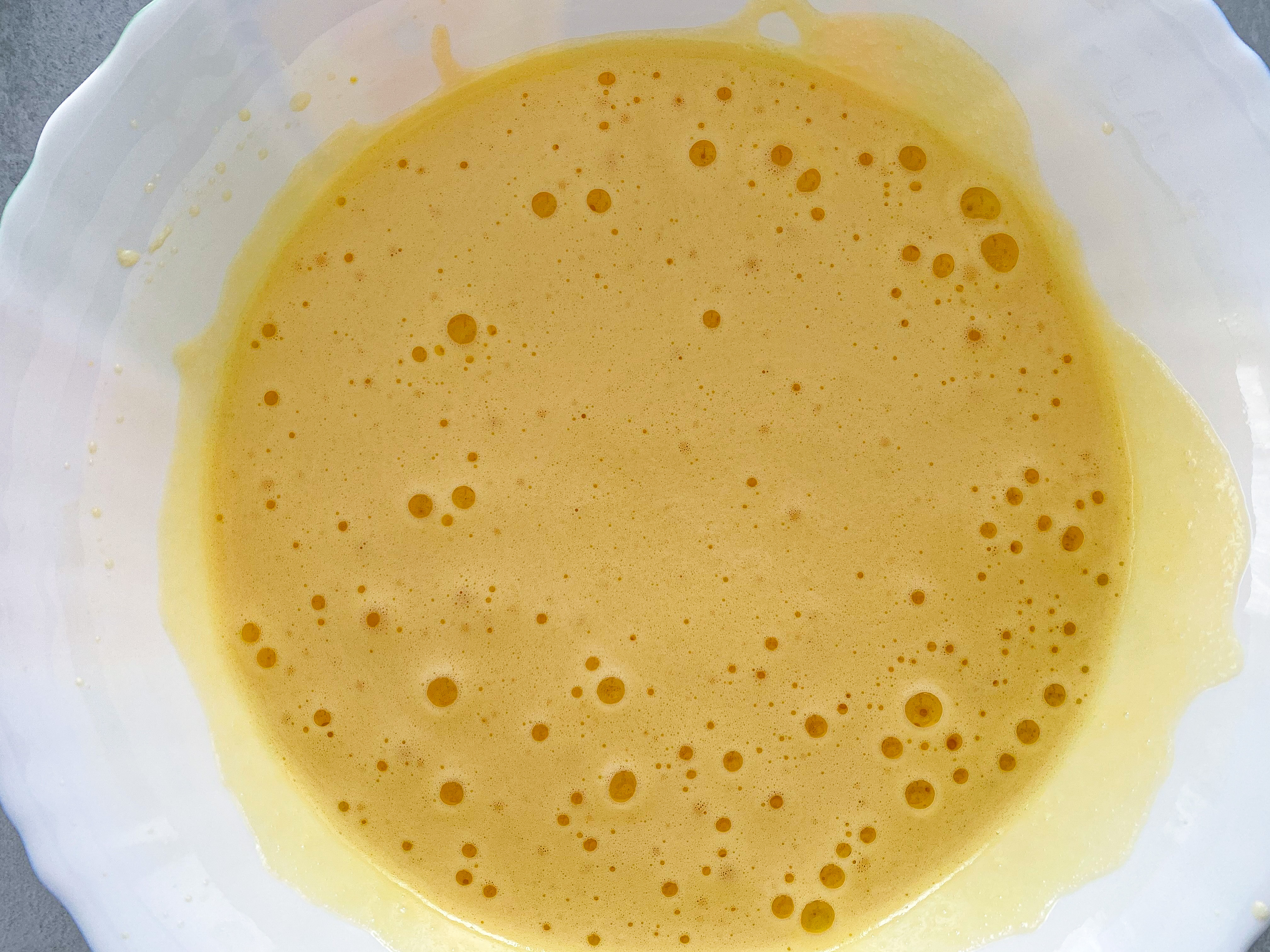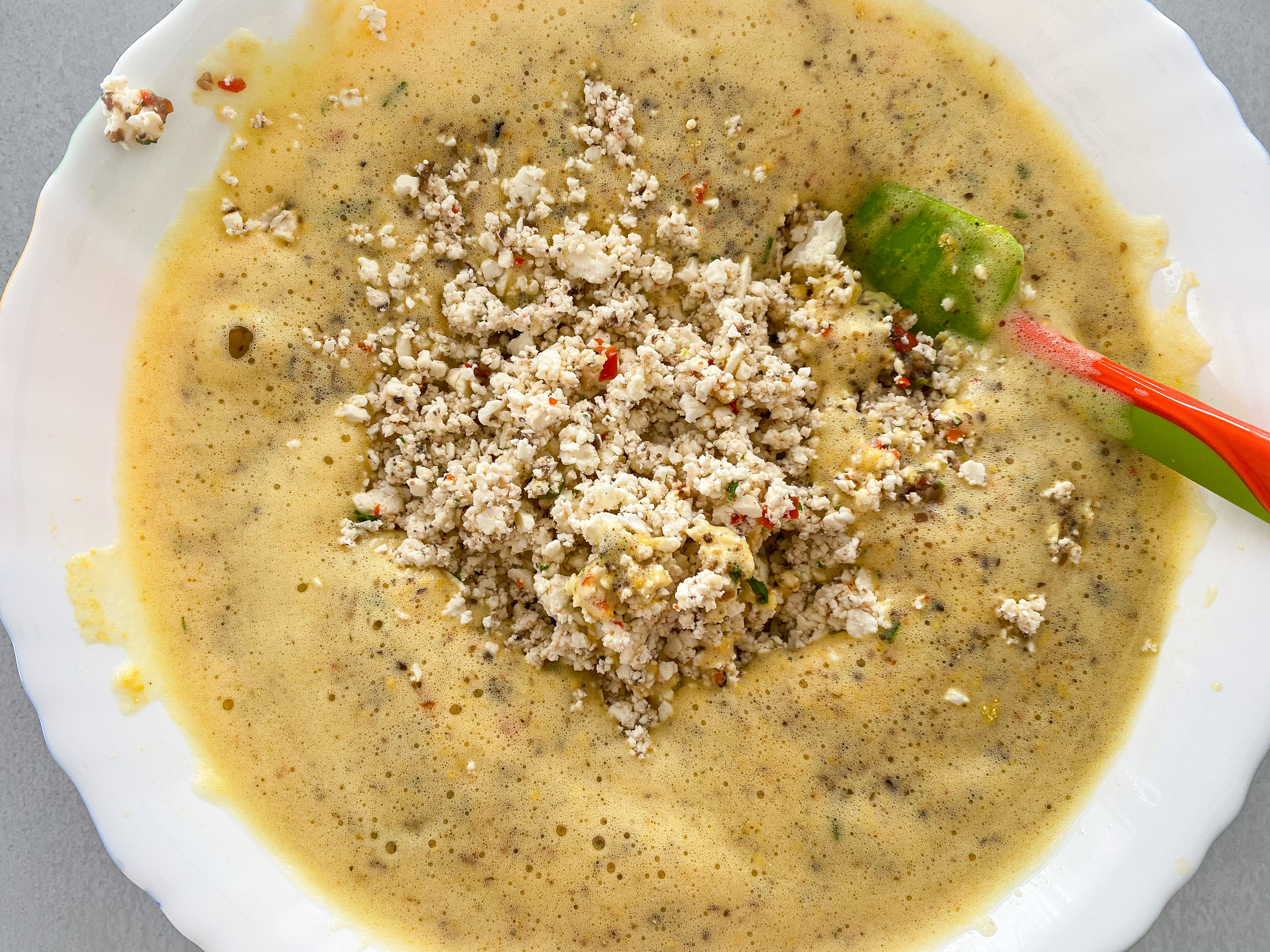 5. Cu ajutorul unui mixer bateți cele 5 ouă până se spumează bine. Adăugați și puțină sare. Țineți cont cât de sărată e și telemeaua folosită de voi și de câtă sare ați mai adăugat și pe amestecul de ciuperci.