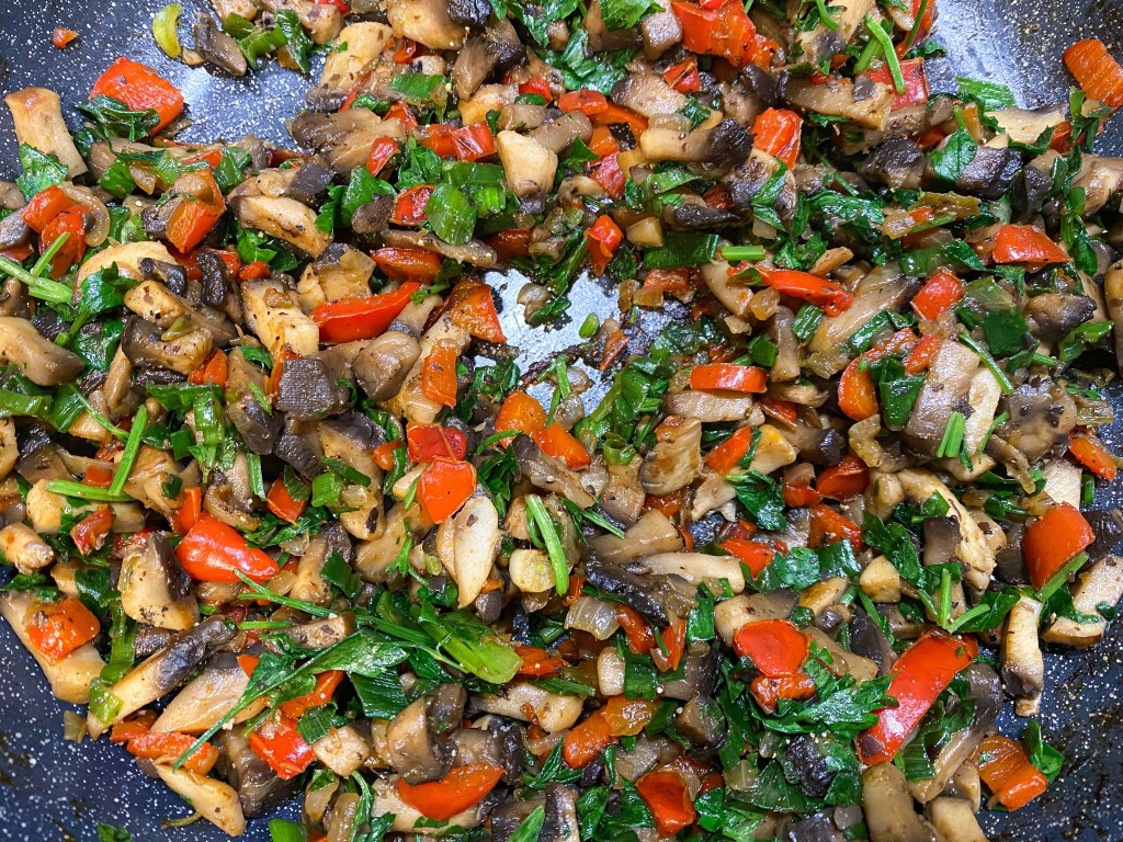 3. Ciupercile se călesc până când apa pe care o lasă se evaporă complet și ele încep ușor să se prăjească. Dacă lasă foarte multă apă, puteți să mai îndepărtați din ea cu câte o lingură ca tot procesul să meargă mai repede. Spre final adăugați partea verde de la ceapă și pătrunjelul tocat. Lăsați compoziția să se răcorească ușor. F important e ca apa să se evapore complet!