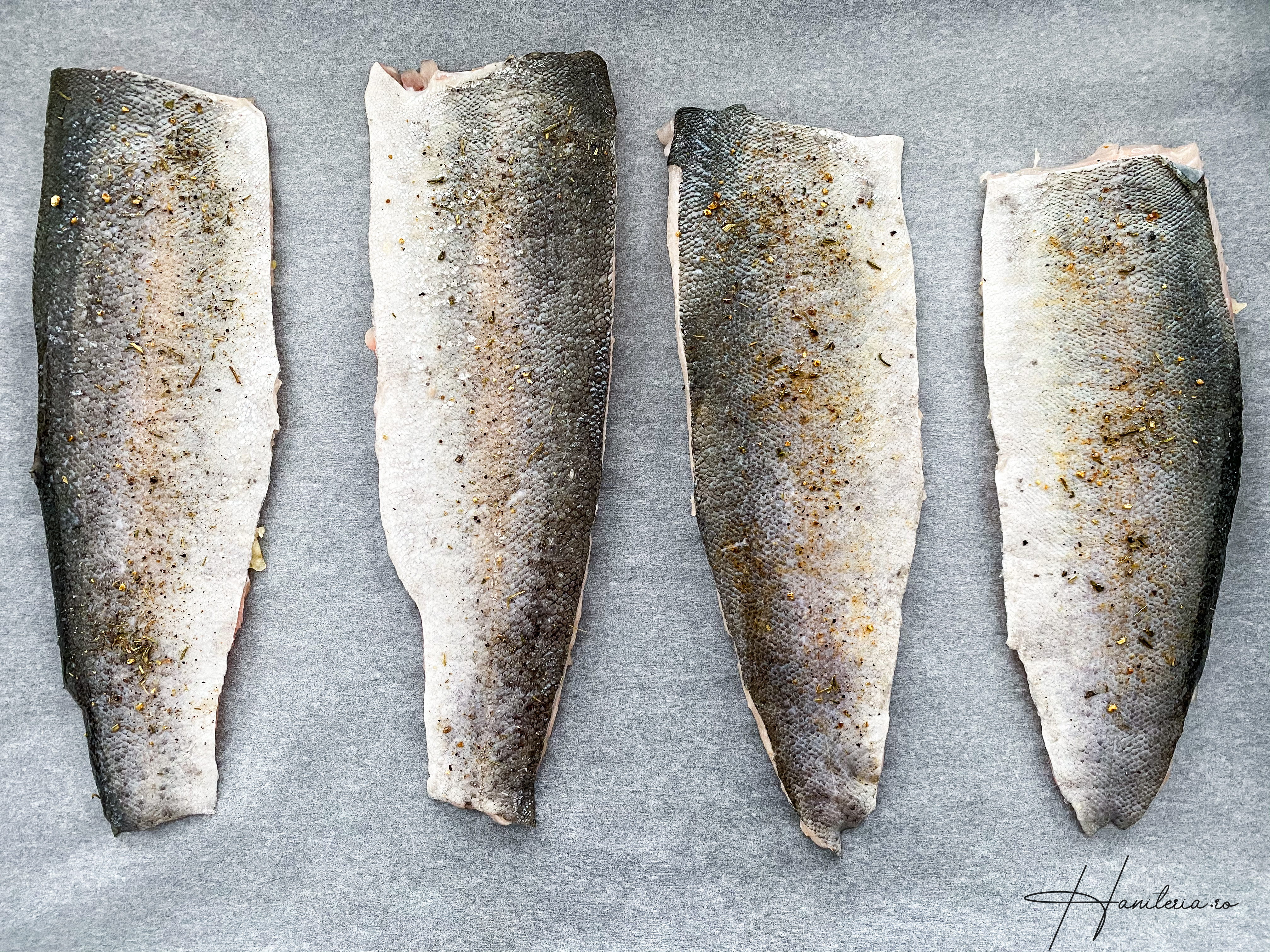 3. Așezați fileurile cu pielea în sus într-o tavă tapetată cu hârtie de copt.