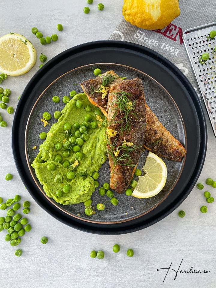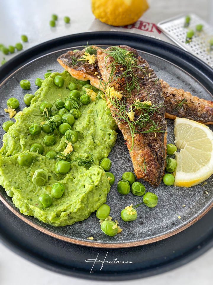 La final am întins pe o farfurie piureul de mazăre (plus boabele întregi), fileurile de păstrăv și am ornat cu puțină coajă de lămâie și frunze de mărar proaspăt. A fost bun, tare bun…mai facem!