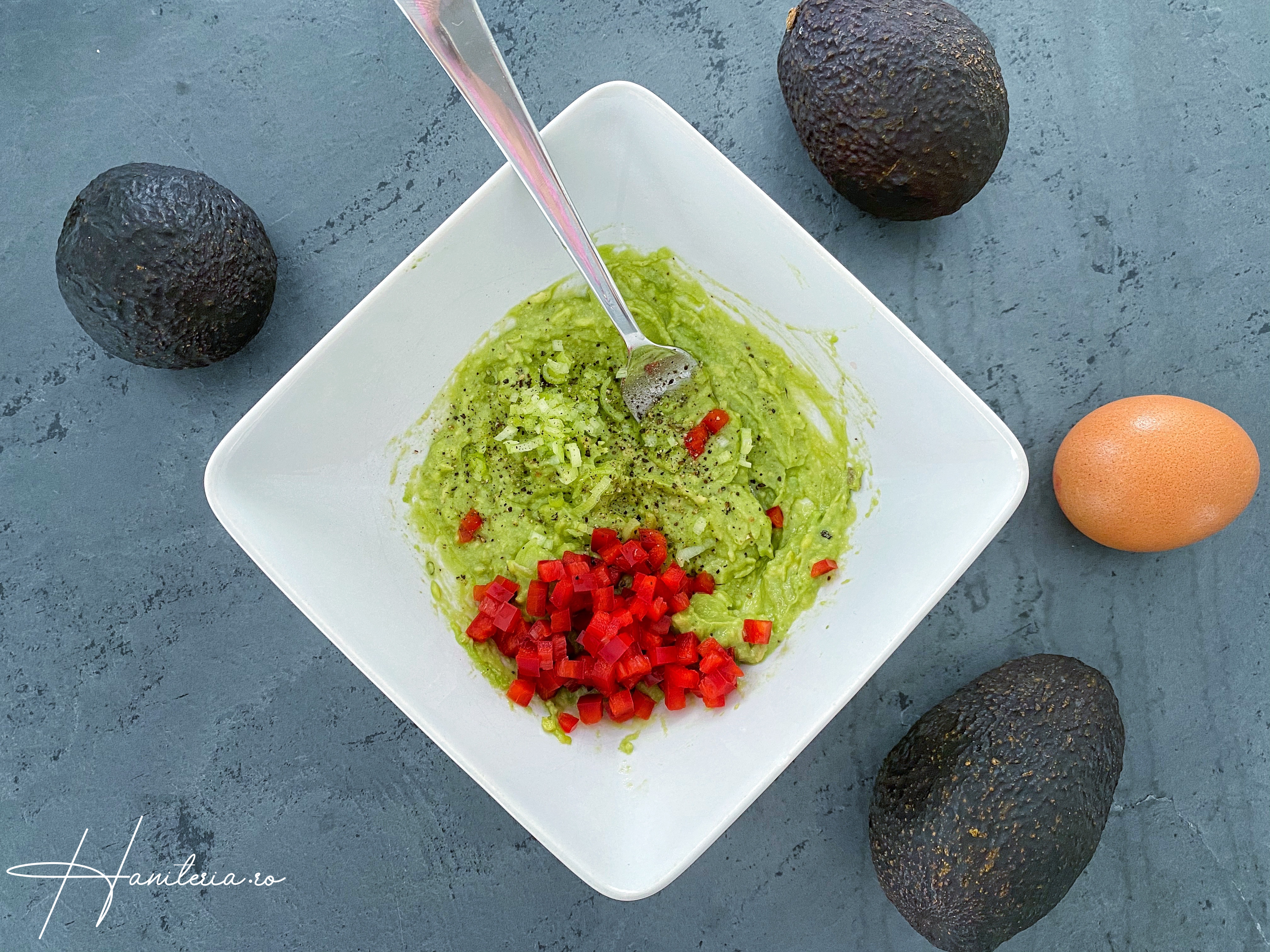 3. Ne apucăm de pasta de avocado. Scoatem miezul de la avocado într-un castronel. Cu o furculiță, zdrobim fructul de avocado într-o pastă fină. Adăugăm sucul de lamâie, sarea și piperul. Dacă doriți să fie ușor picant, puteți să adăugați și câțiva stropi de sos chili sau ardei iute tocat. Tăiem ceapa și ardeiul gras mărunt și le adăugăm și pe ele în compoziție. Eu azi am folosit partea ușor mai albă de la o ceapă verde. Amestecăm bine. Nu uitați să verificați să fie potrivit de condimentat cu sare și piper.