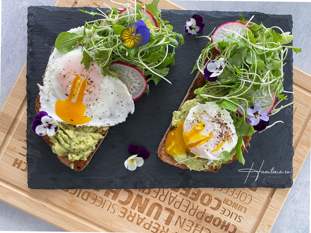 Pentru impresia artistică am pus și niște feliuțe de ridichi și niște flori comestibile (total opționale). Foarte bine merge combinația și cu roșii cherry lângă. Nu au prins poza.