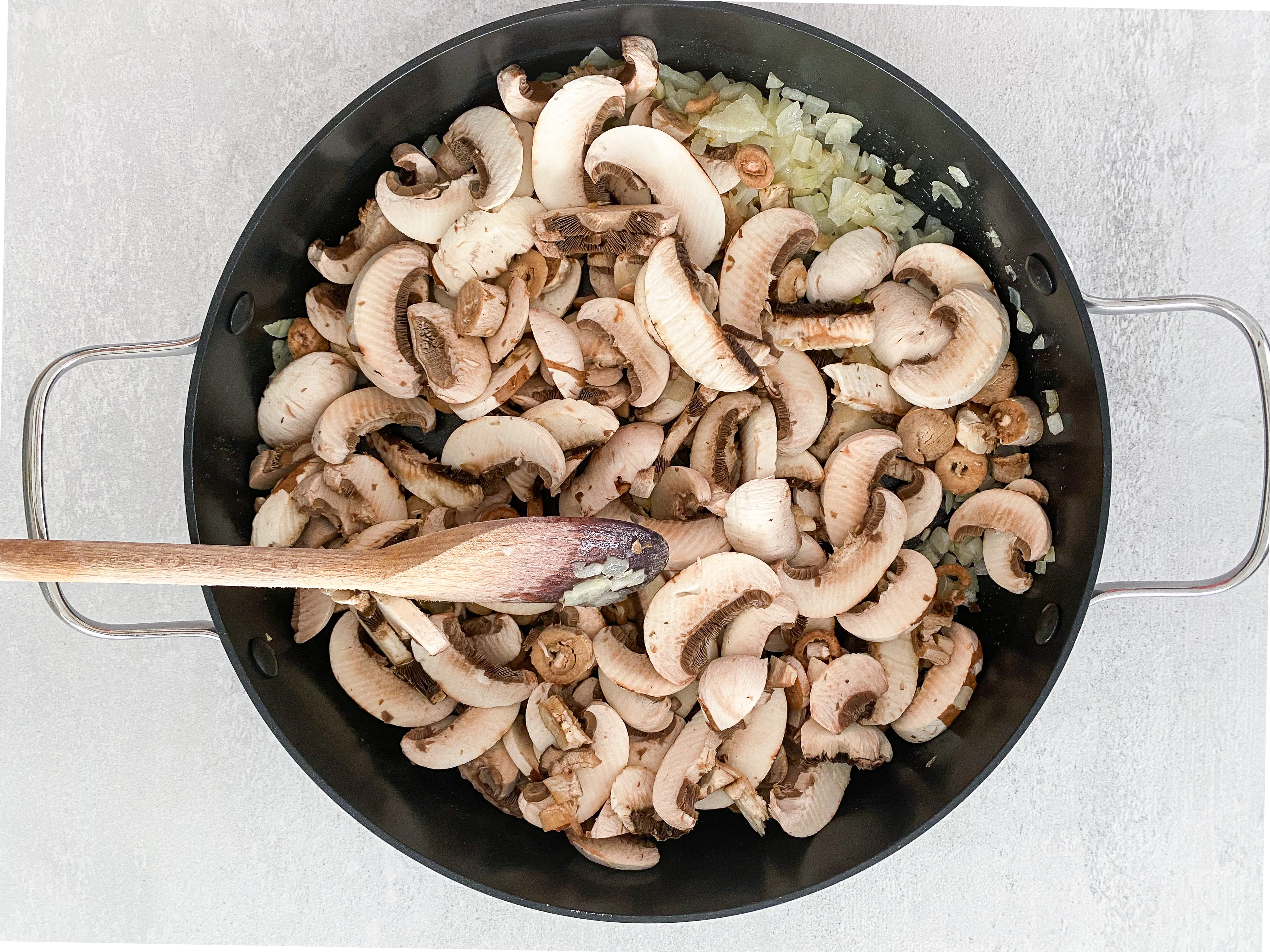 2. Când ceapa s-a înmuiat, adăugați și usturoiul tăiat feliuțe. După un minut adăugați și ciupercile curățate și tăiate felii.