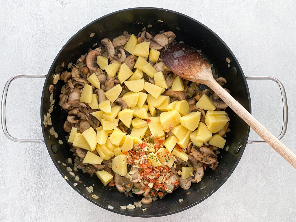 3. Când ciupercile s-au înmuiat ușor și au început să lase zeamă, adăugați și cartofii tăiați cubulețe. Adăugați și lingura de legume deshidratate, sarea, piperul negru măcinat și condimentele italienești.
