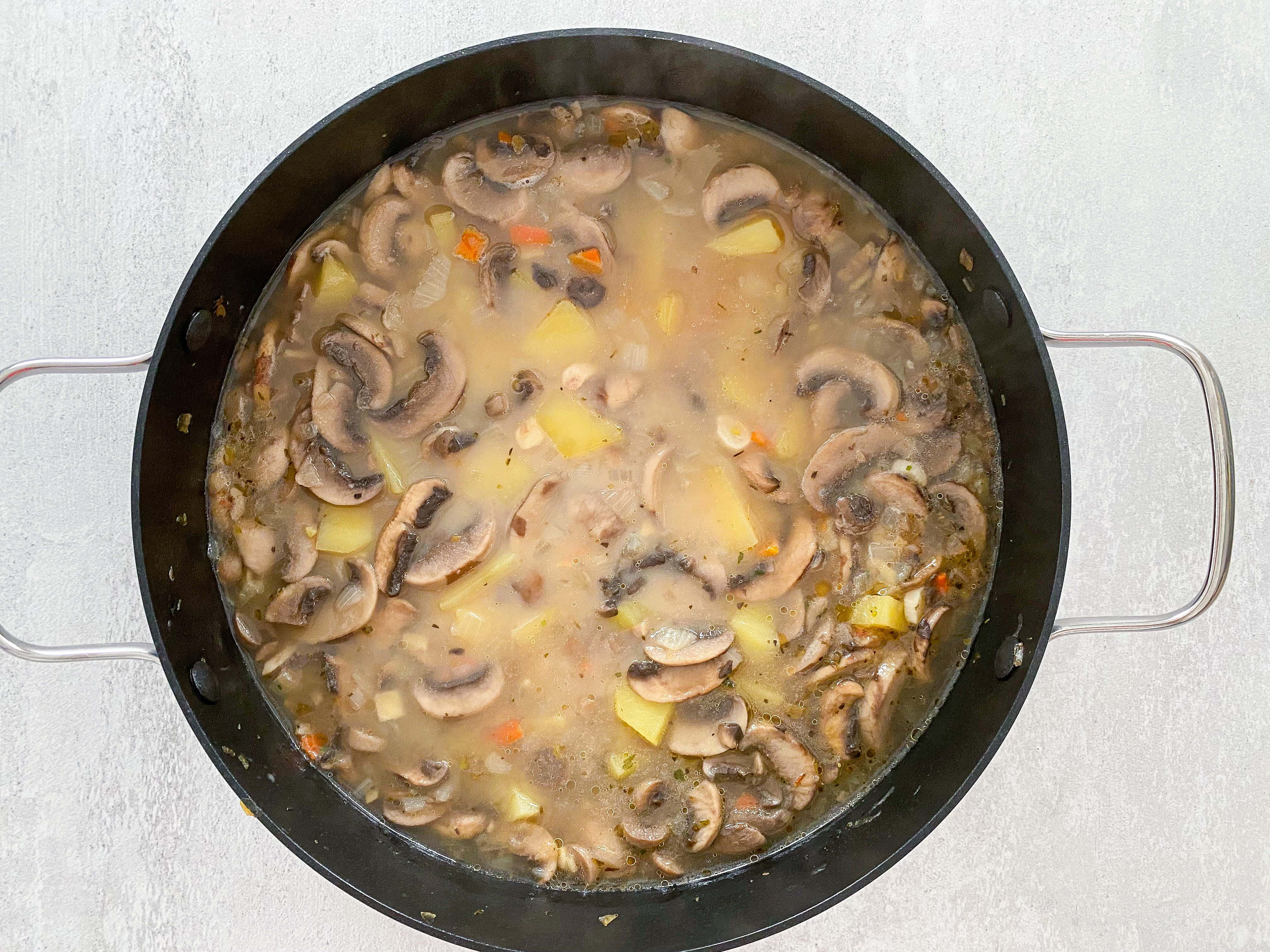 4. Adăugați 1L de apă și dați la fiert cu capac, foc mediu, până când ciupercile și cartofii sunt fierți – aproximativ 15-20 de min din momentul în care apa începe să fiarbă.