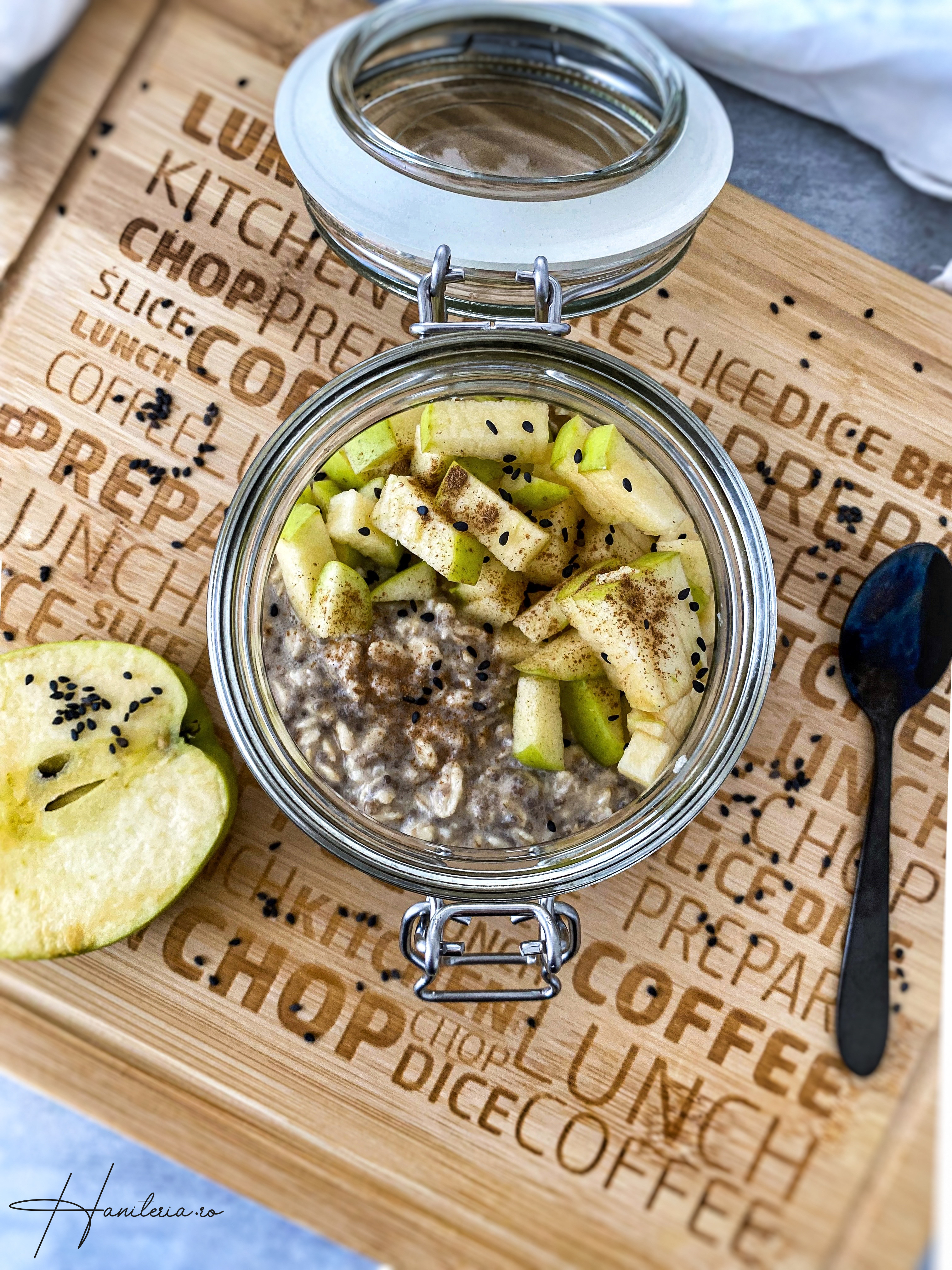 A doua rețetă de ovăz la rece (overnight otas) de pe blog este una care nu putea să lipsească, în combinația mea preferată de măr și scorțișoară. Pentru un gust și mai intens de măr și mai cremos, am folosit un piure de mere fără adaos de zahăr și a ieșit super gustos. Ce e drept, e posibil să fiu puțin subiectivă, având în vedere cât de mult iubesc eu scorțișoara. Un mic dejun cu mulți carbohidrați, dar și plin de fibre.