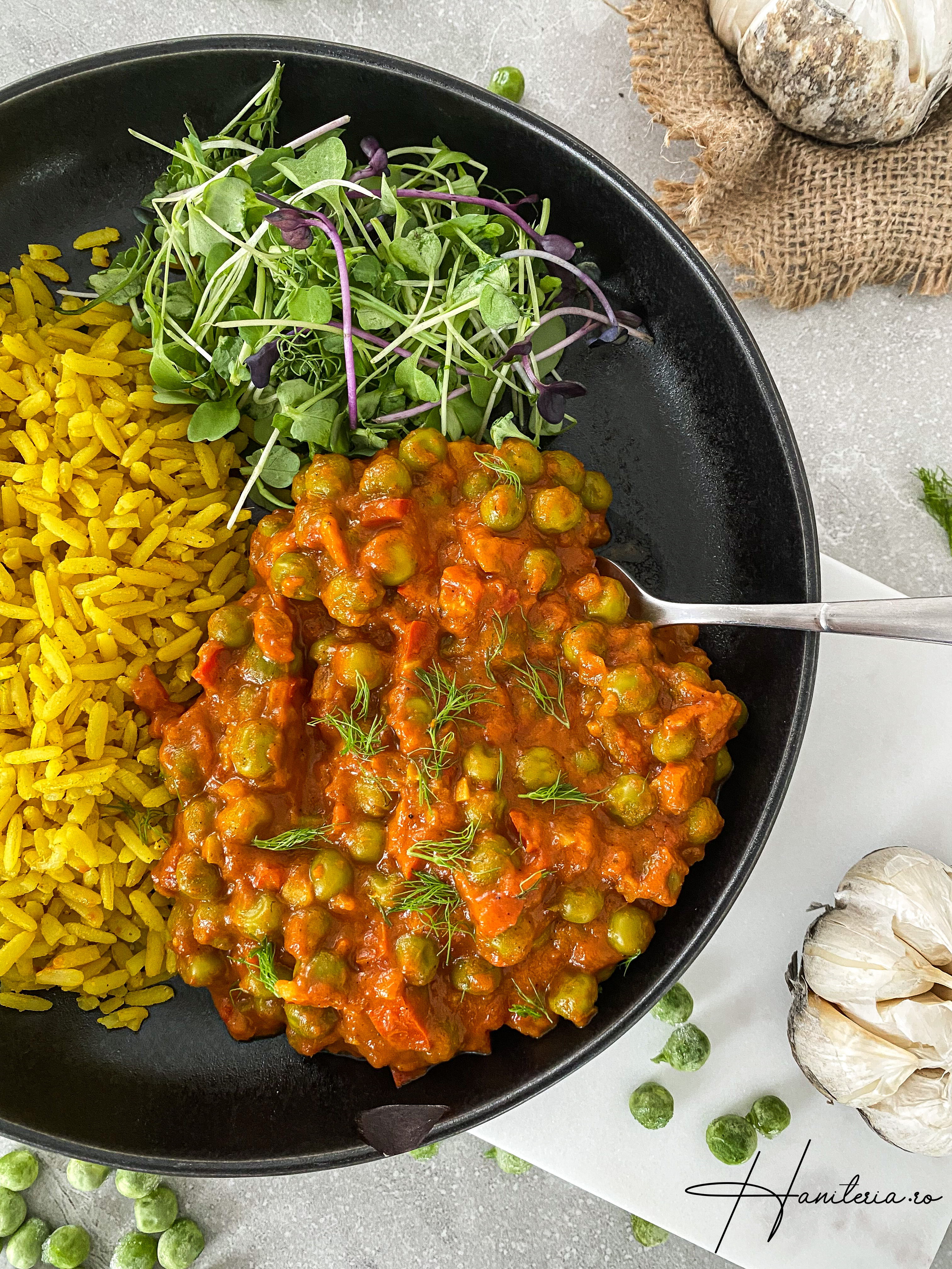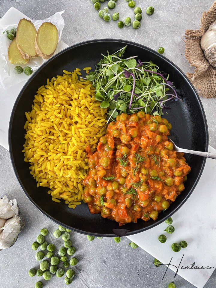 Am servit această mâncare de mazăre cu niște orez natur/ intergal alături. Orezul a fost unul express de la panzani gata în 10 minute pe care l-am fiert cu sare, turmeric si condimente pentru orez a la Mrs Wong.